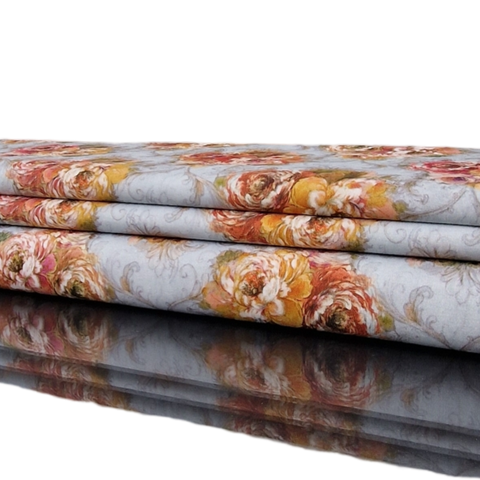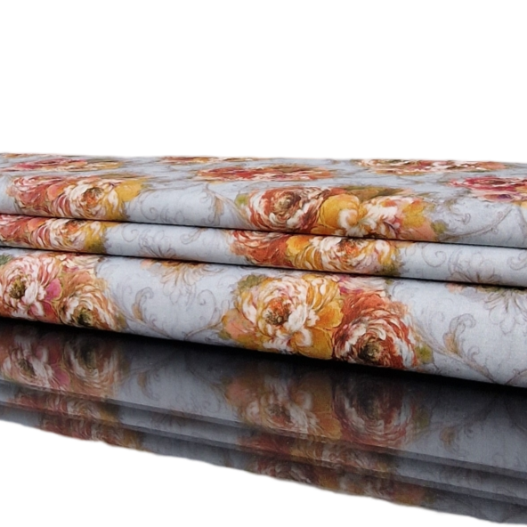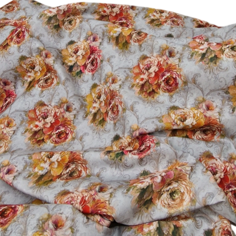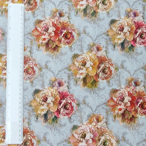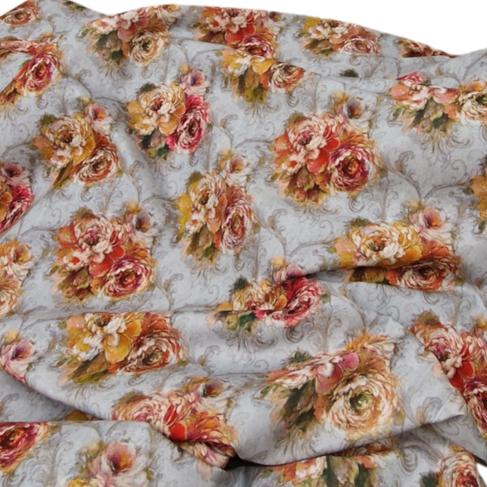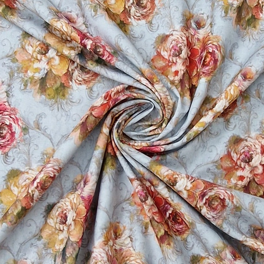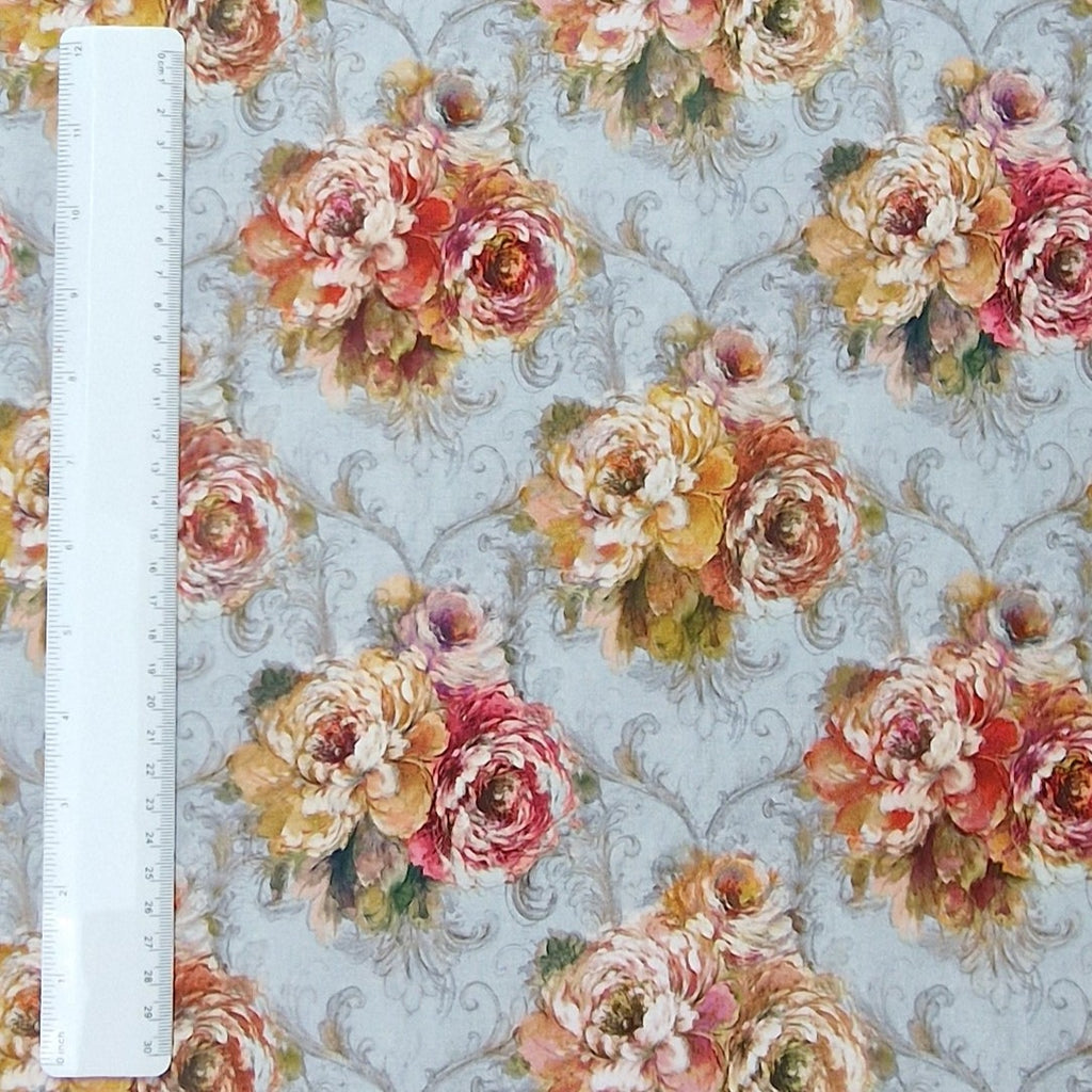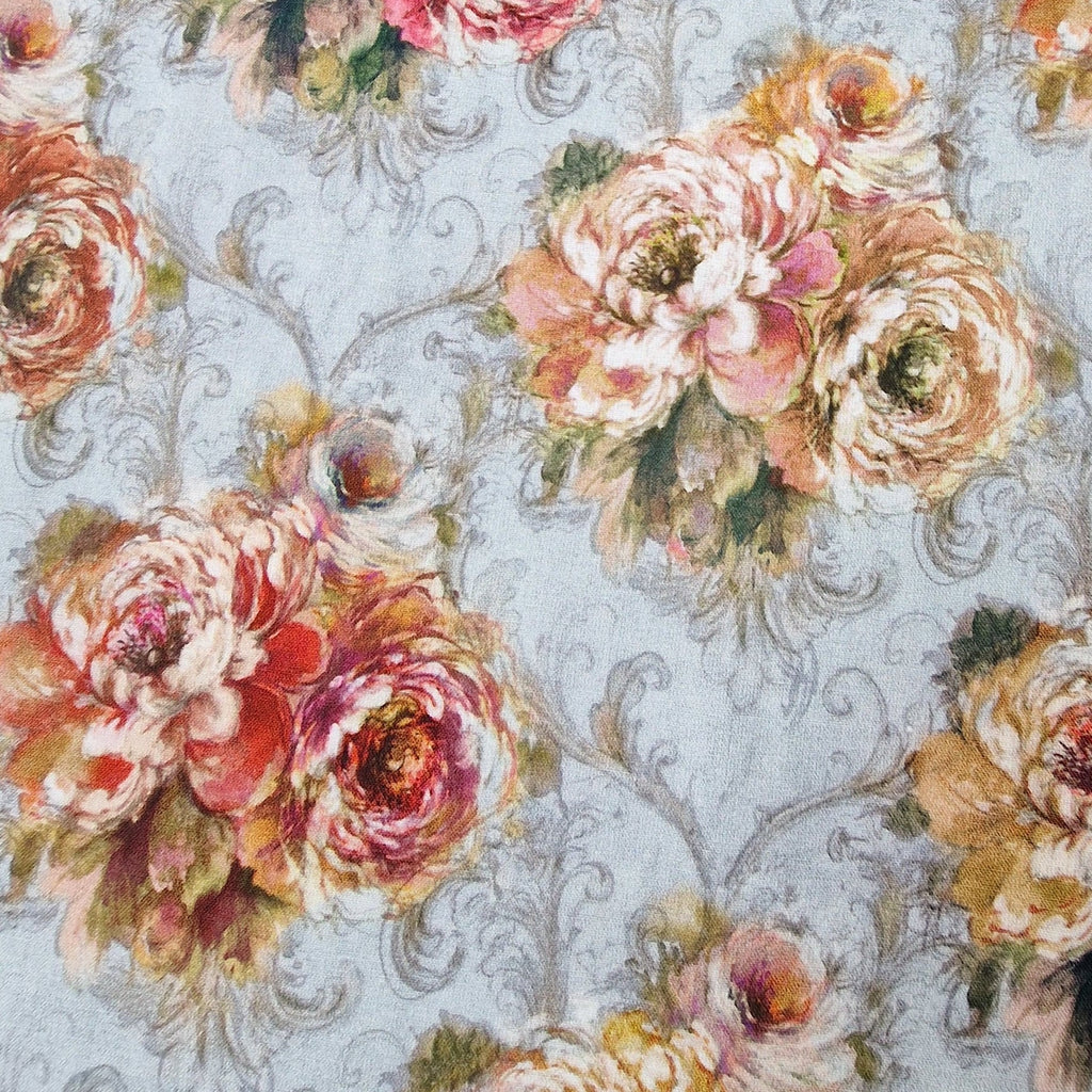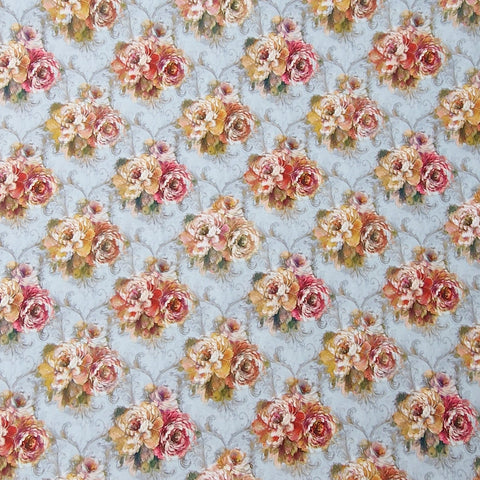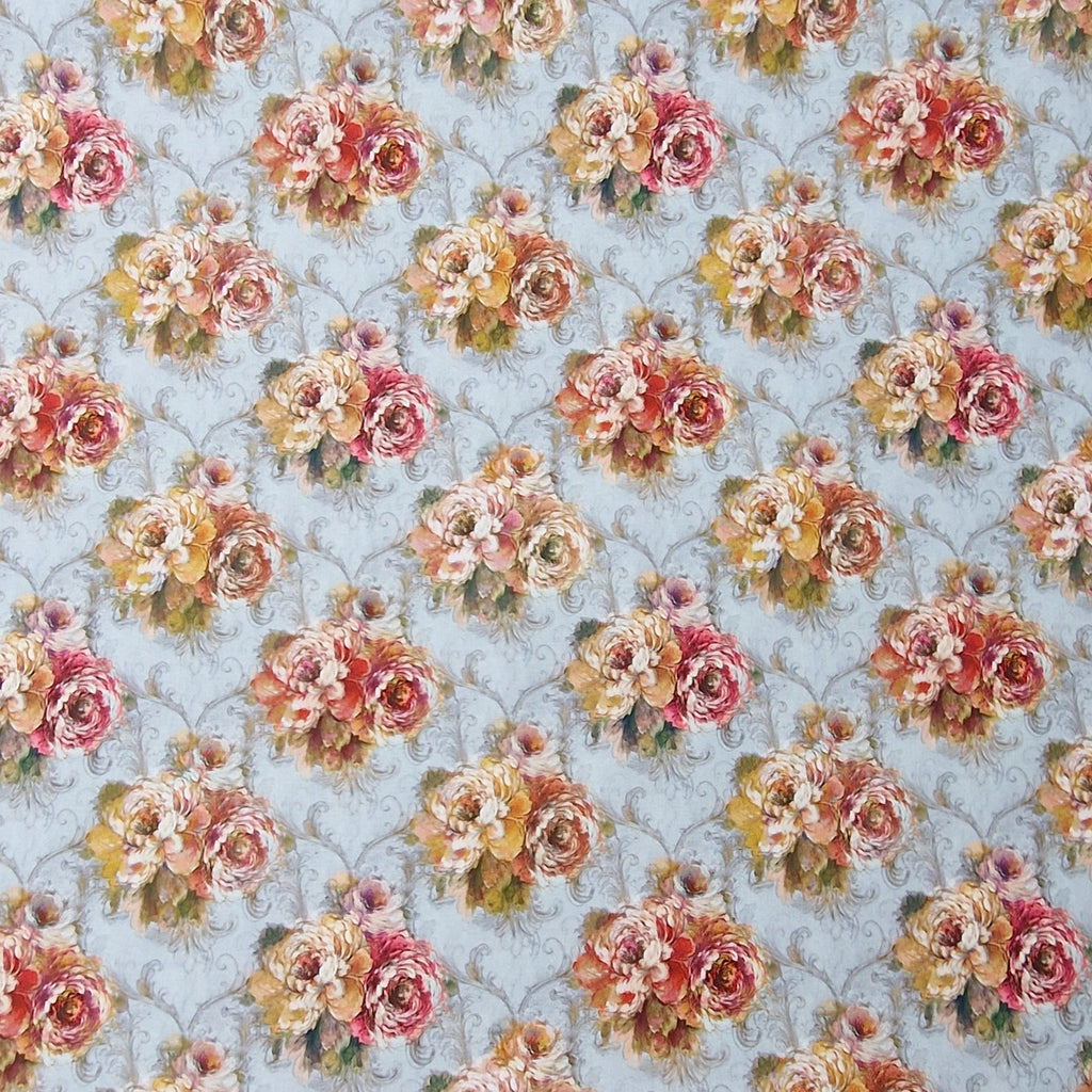 Hellblauer Baumwollstoff mit schönen Rosen und feinen Ornamenten im Hintergrund.