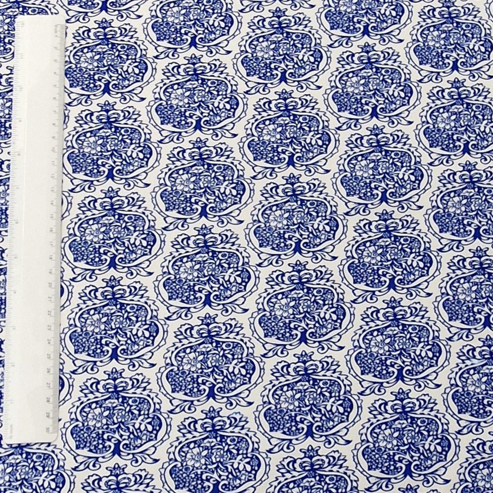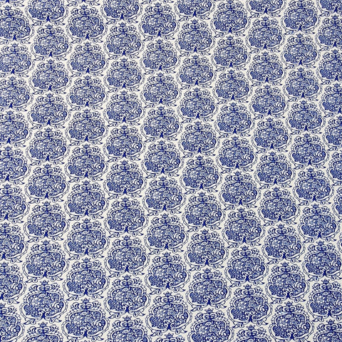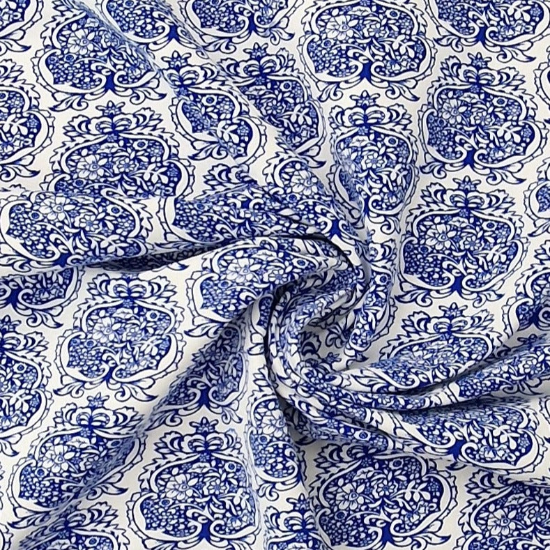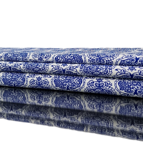 Weiße Baumwolle mit blauen Ornamenten.