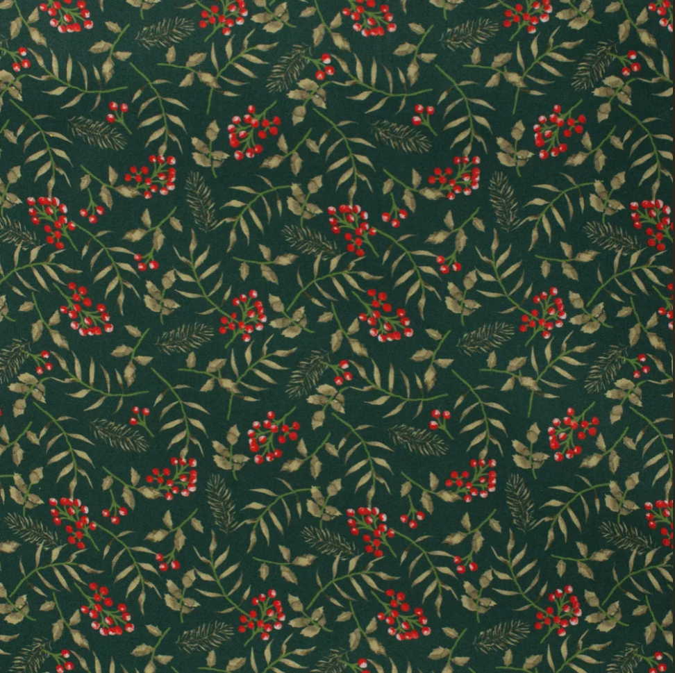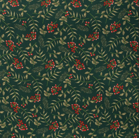 Baumwollstoff aus 100% Baumwolle in grün mit goldenen und roten Ästen / Blumen als Aufdruck.