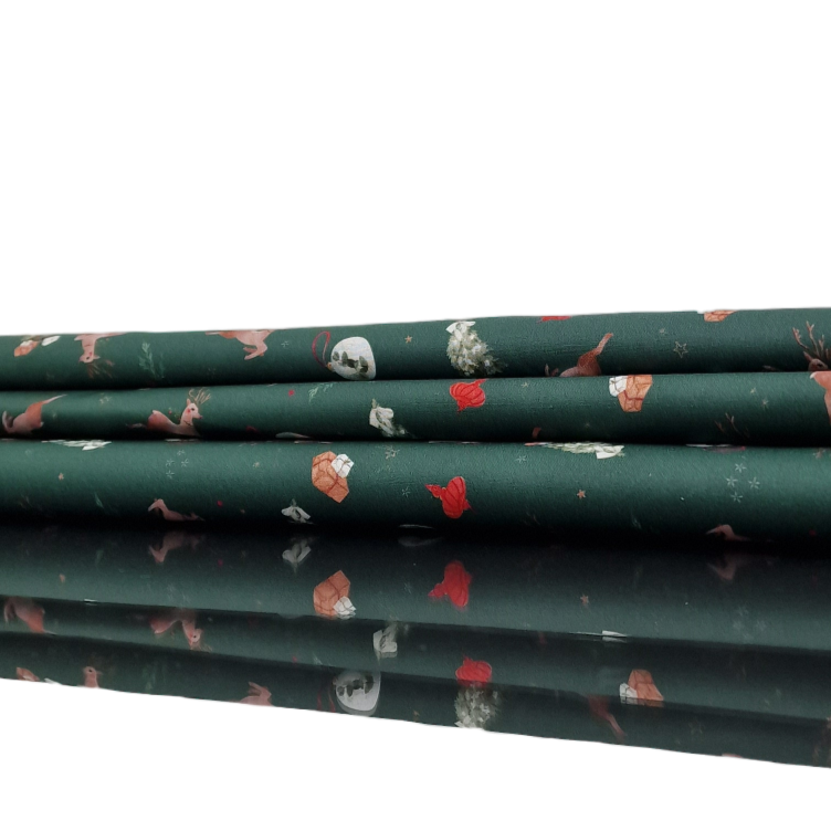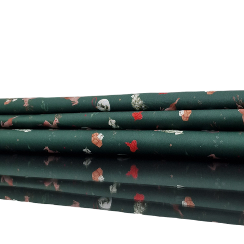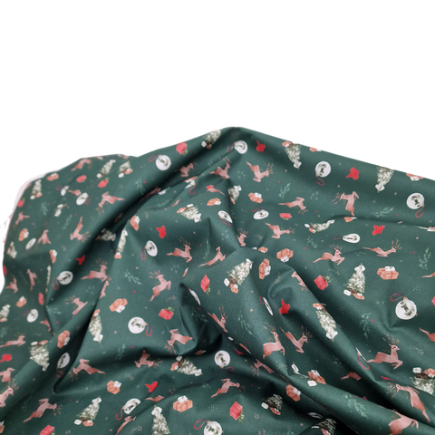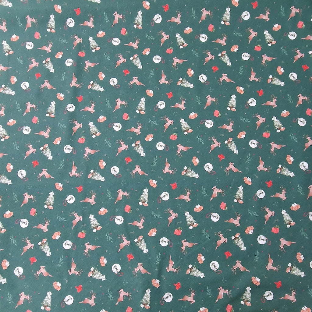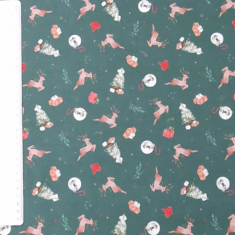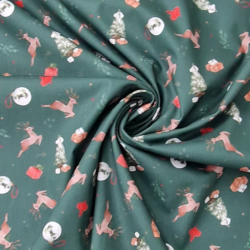 Baumwollstoff aus 100% Baumwolle in waldgrün mit Rentieren, Tannenbäumen, Geschenken und Christbaumkugeln als Aufdruck.