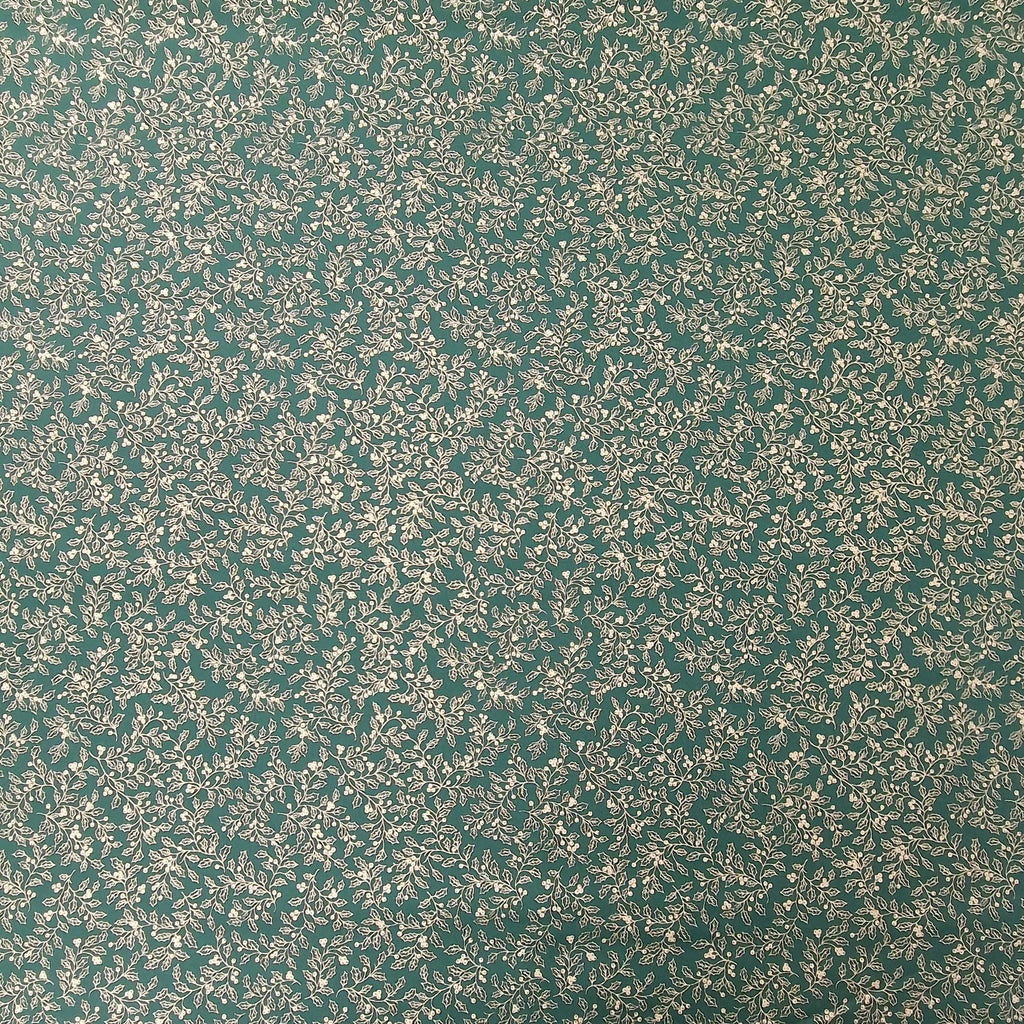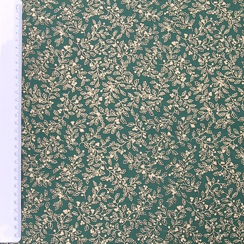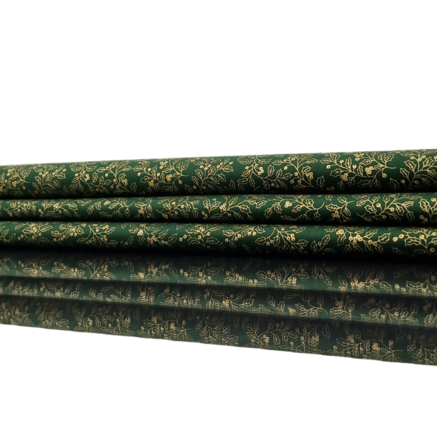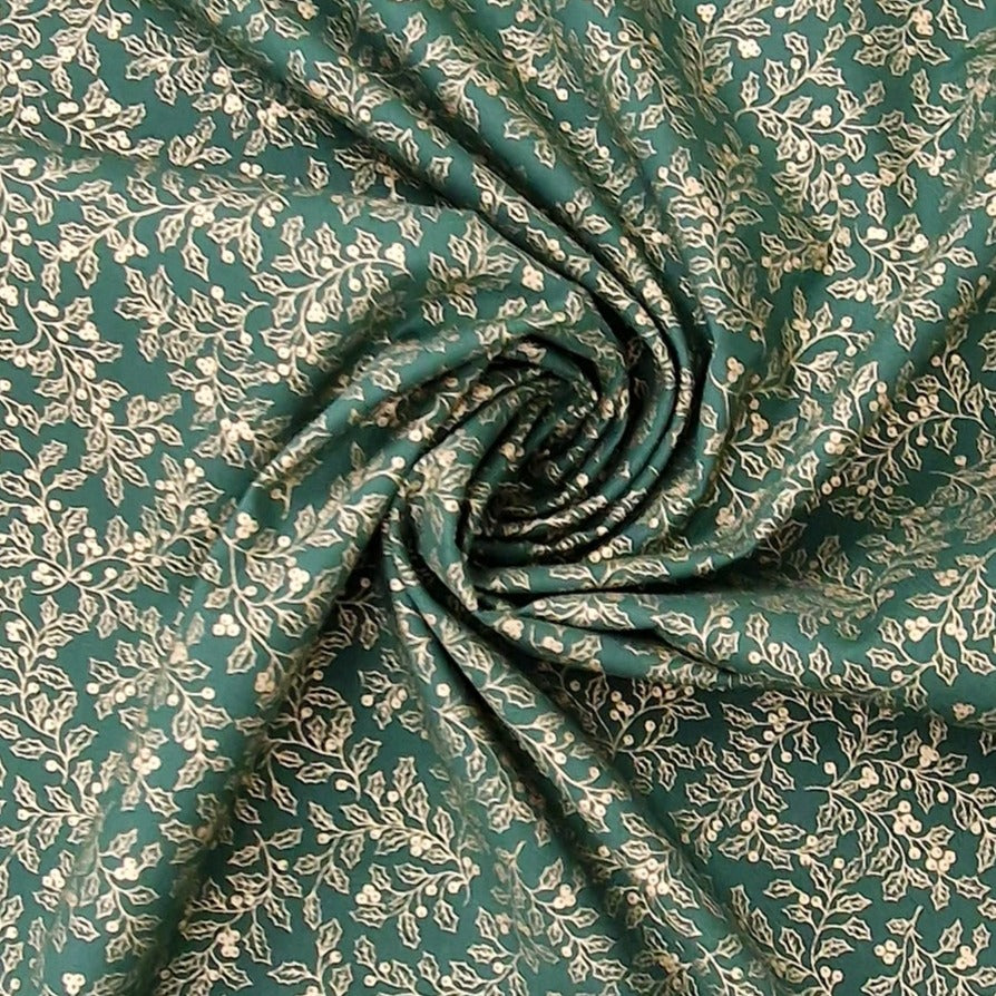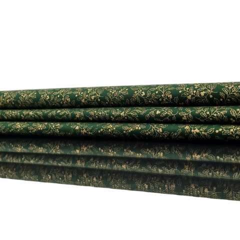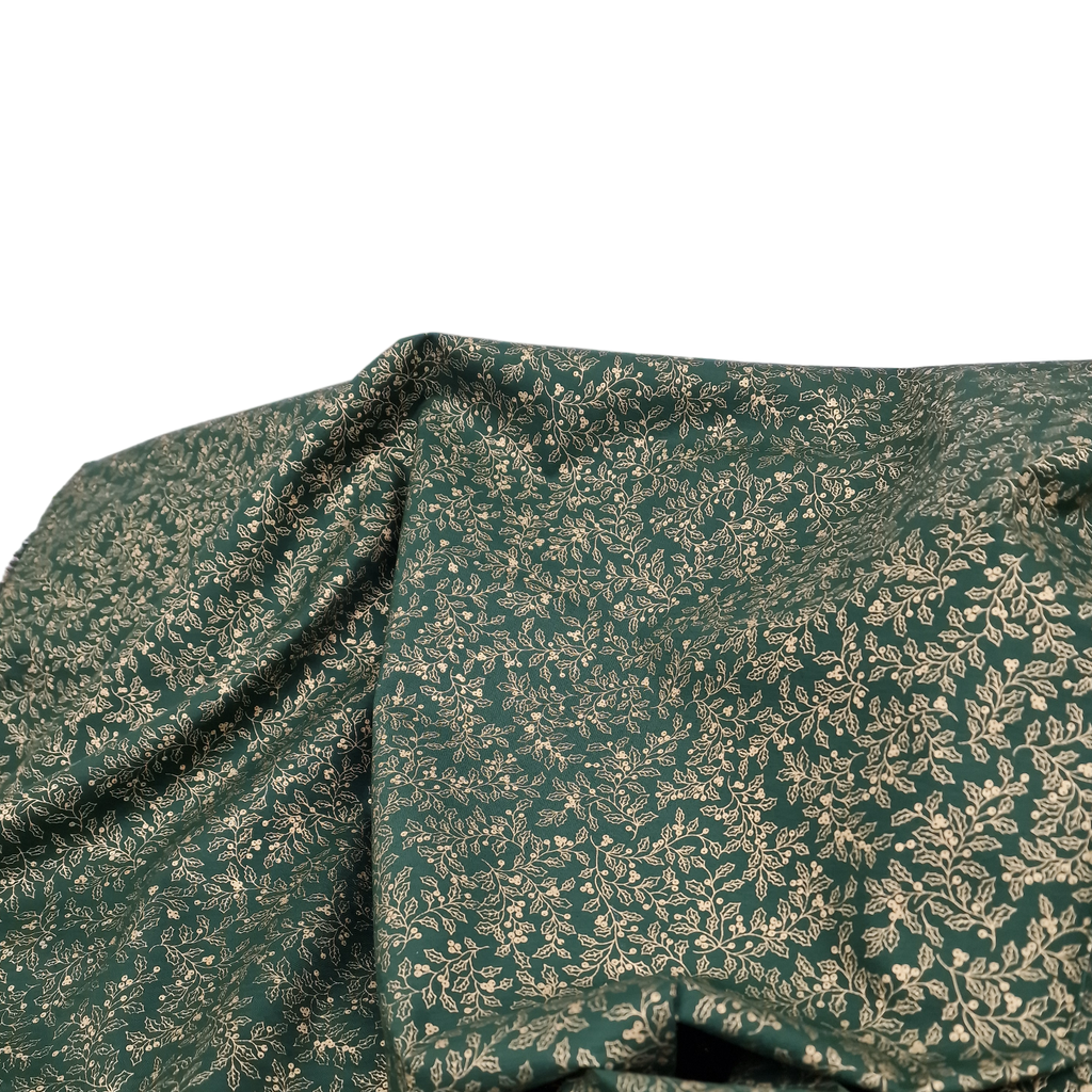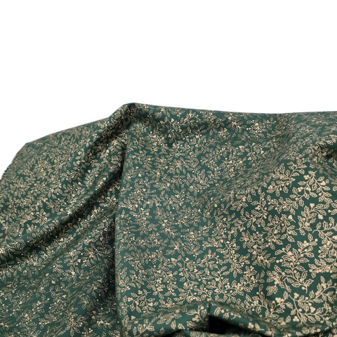 Baumwollstoff aus 100% Baumwolle in grün mit goldenen Pflanzen als Aufdruck.