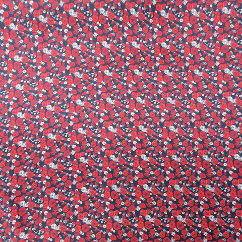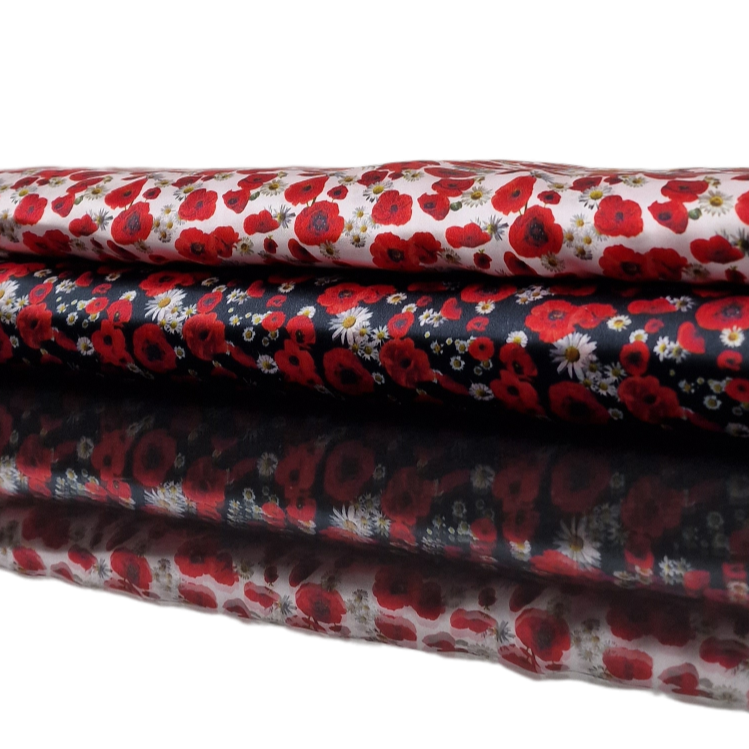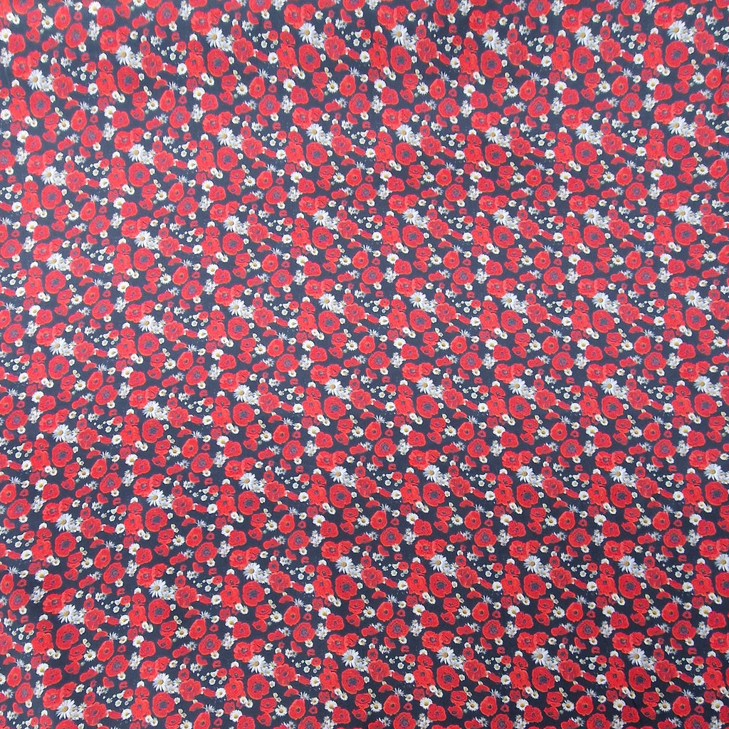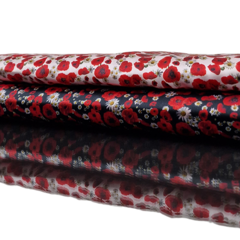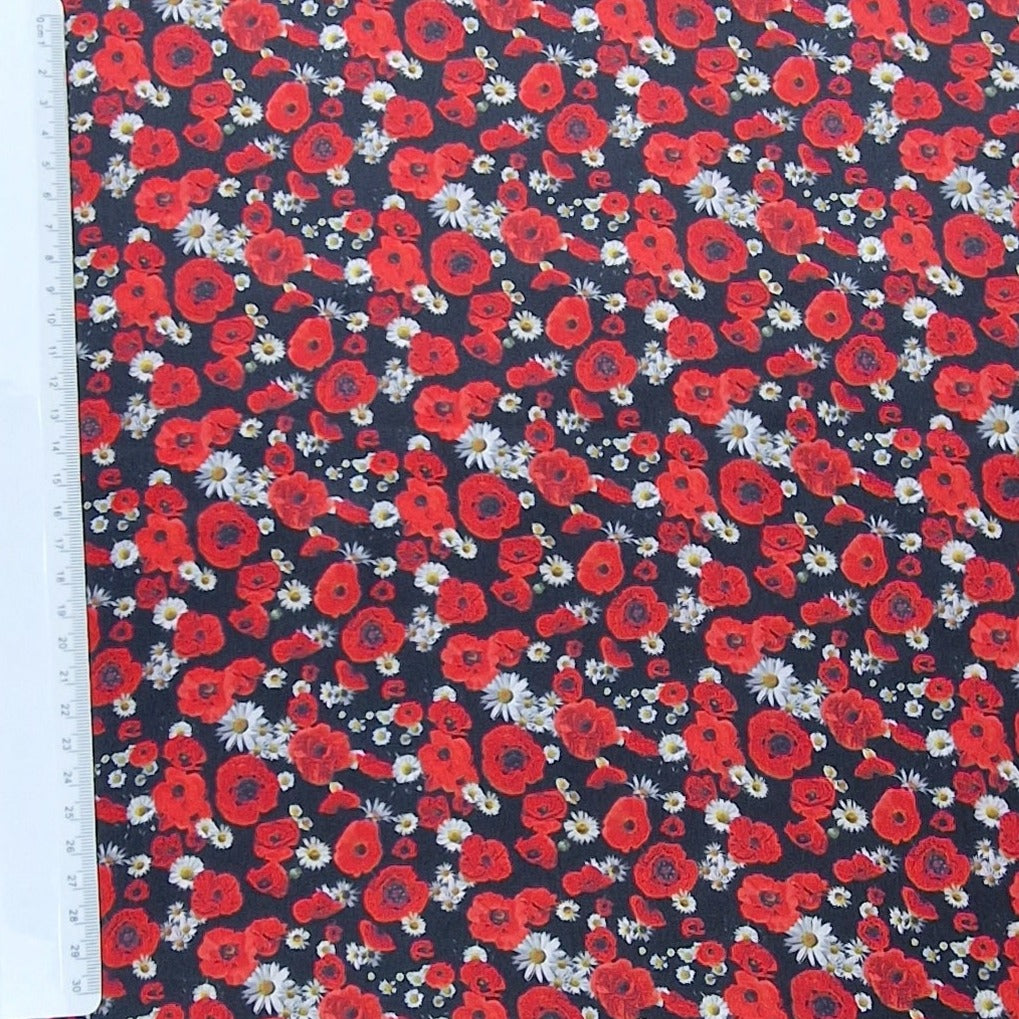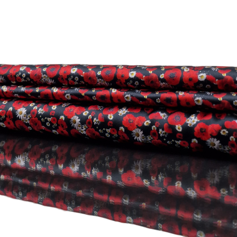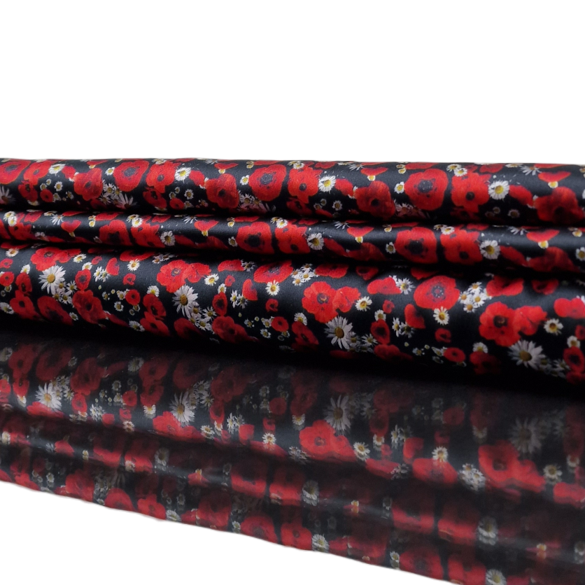 Baumwolle Satin in schwarz mit rotem Mohn als Aufdruck.
