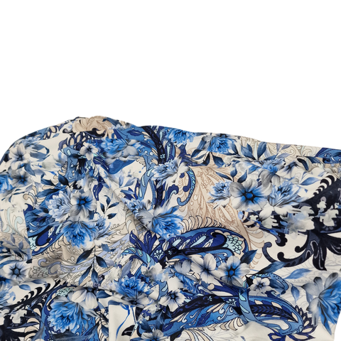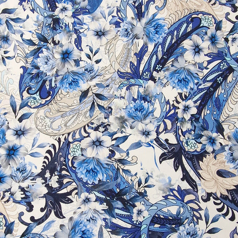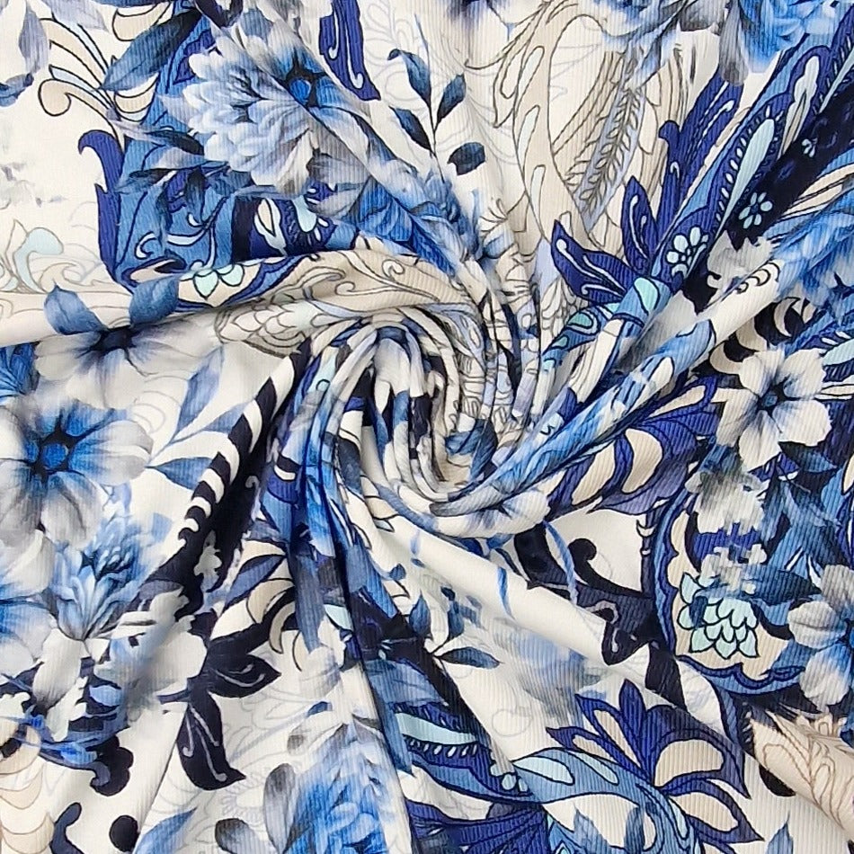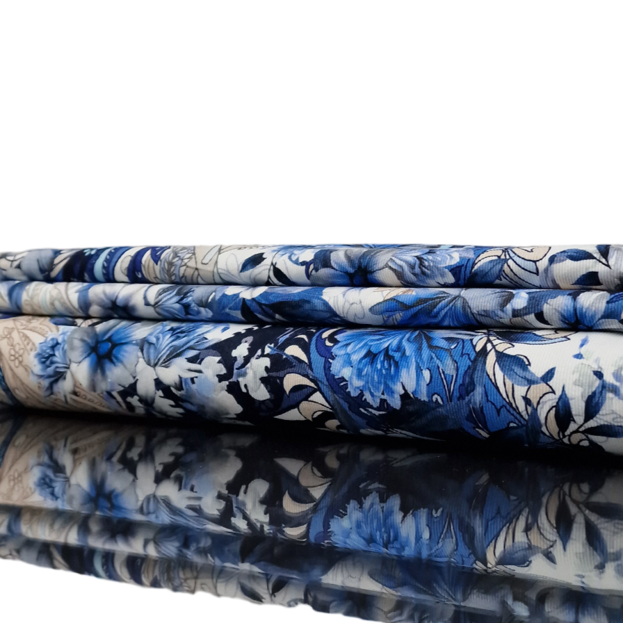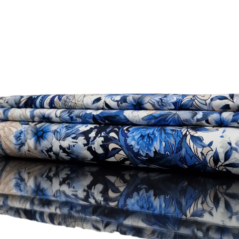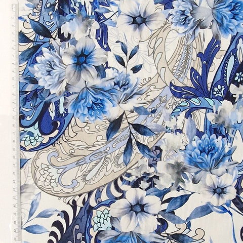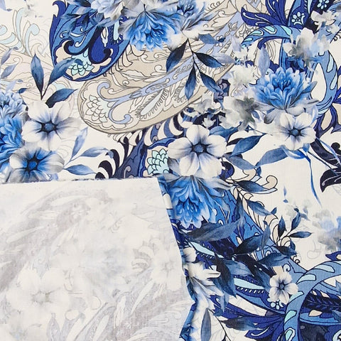 Weicher Baumwolljersey in der Farbe weiß mit blauen Blumen als Aufdruck.