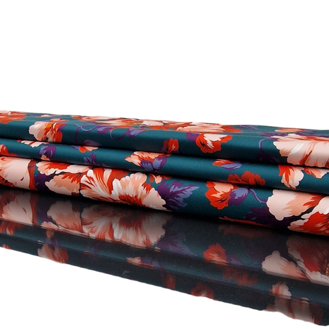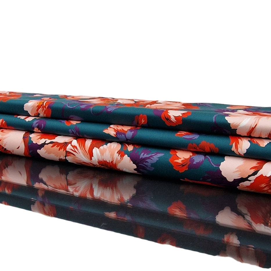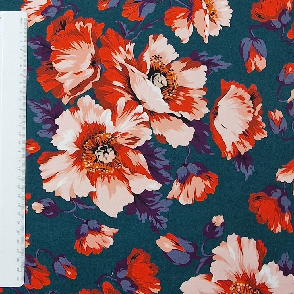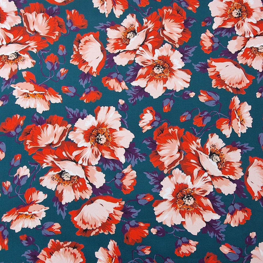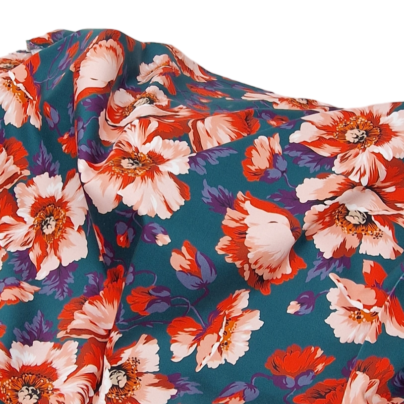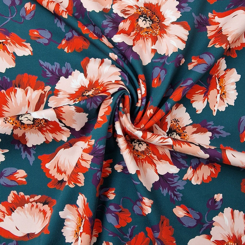 Unser Stoff Samir ist im Hintergrund Petrolfarben und als Aufdruck hat er rote Blumen.