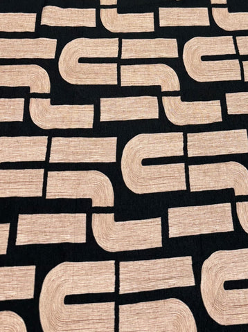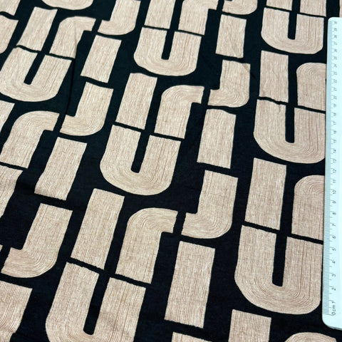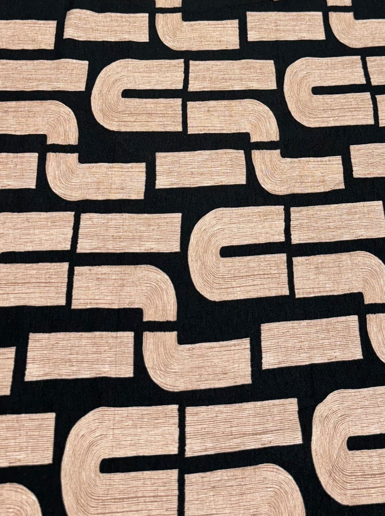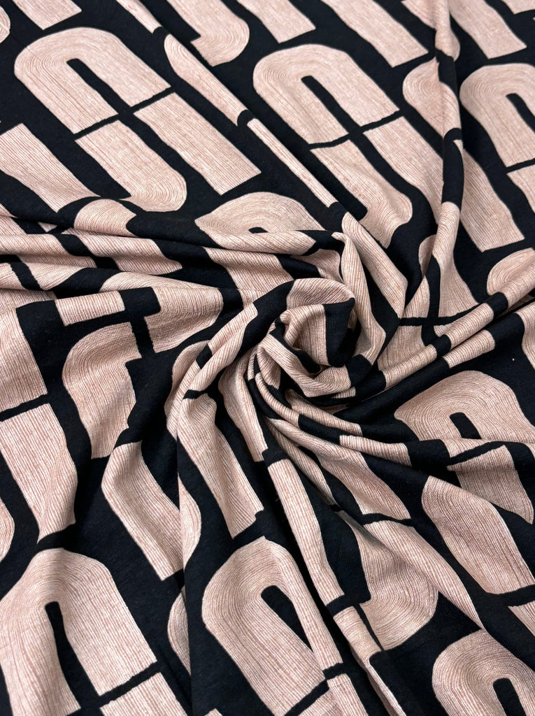 Jersey schwarzgrundig mit einem Muster in Holzoptik.