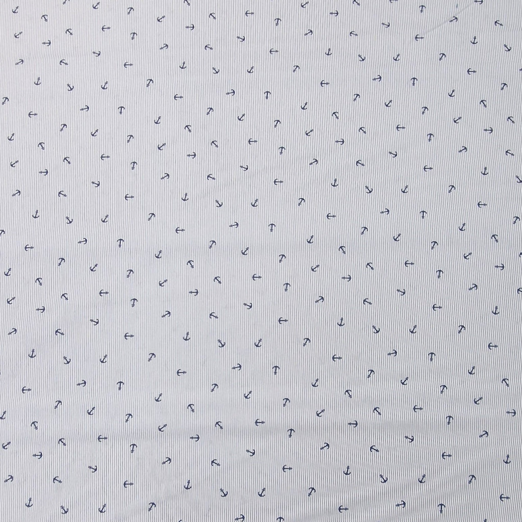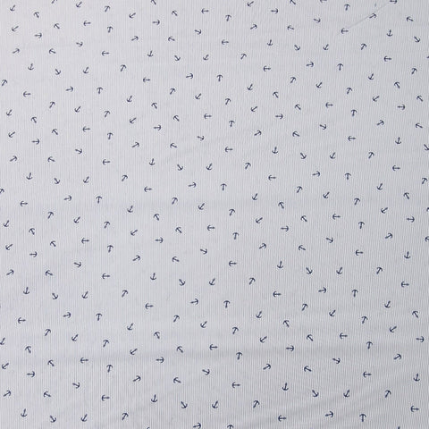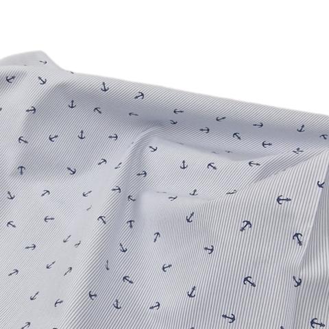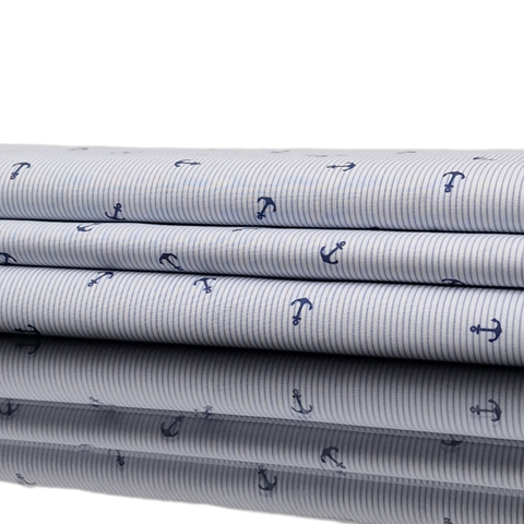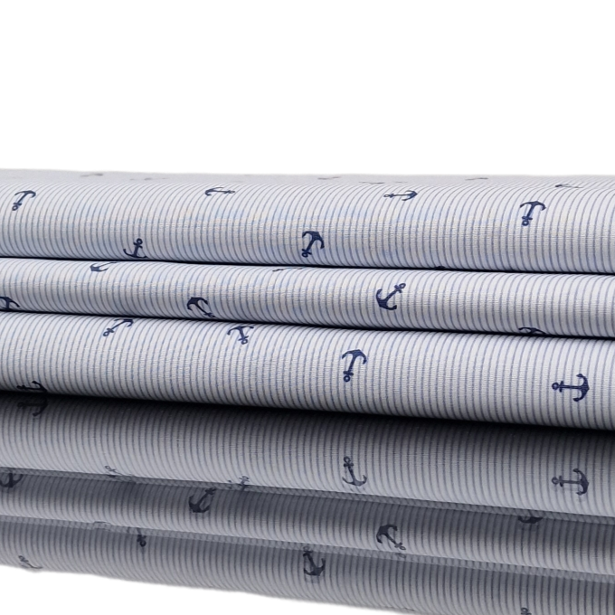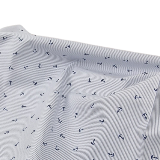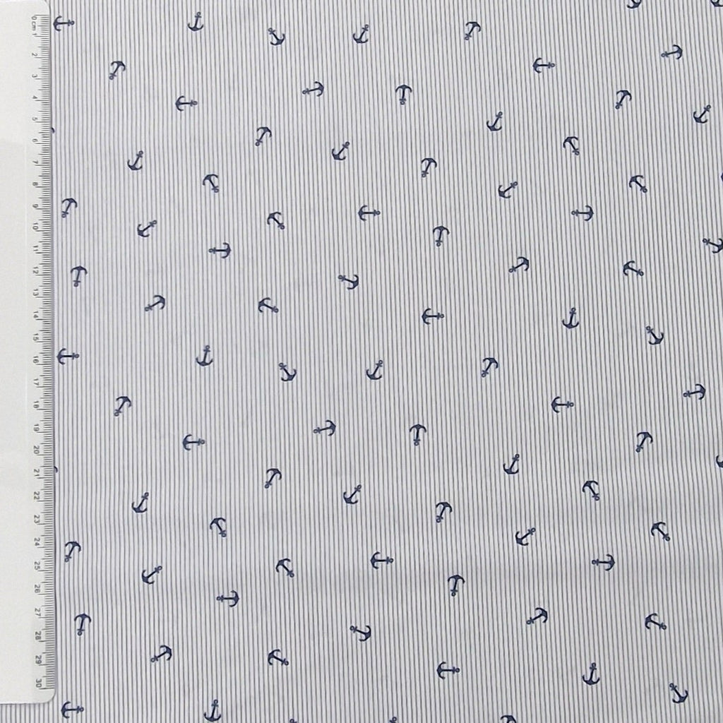 Weiß / blau gestreifter Popelin mit kleinen (1cm) blauen Ankern als Aufdruck.