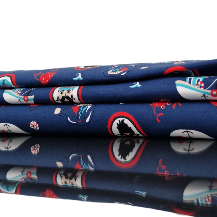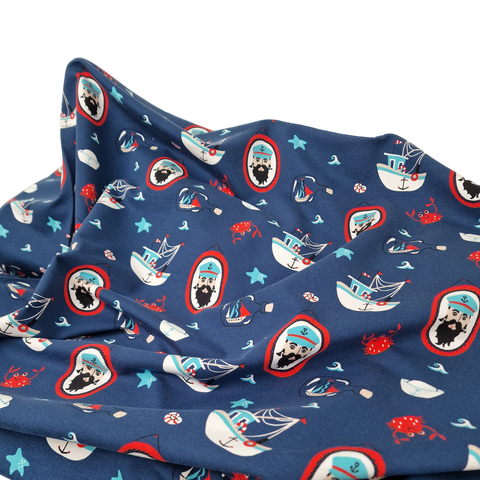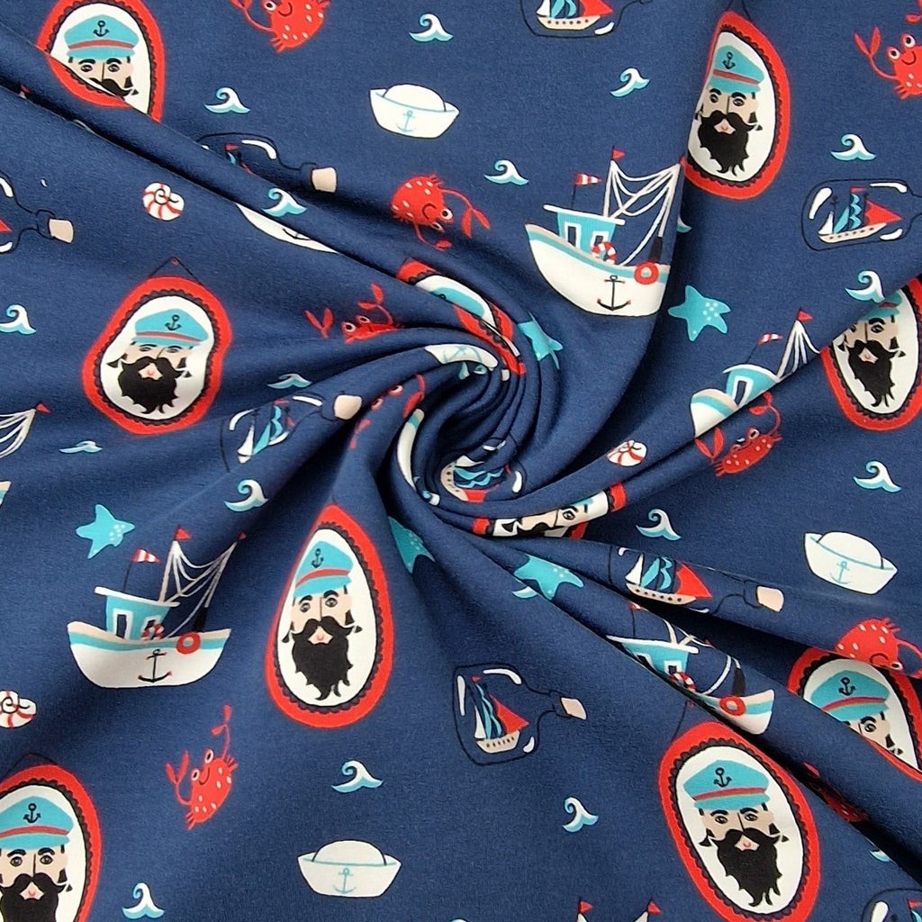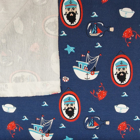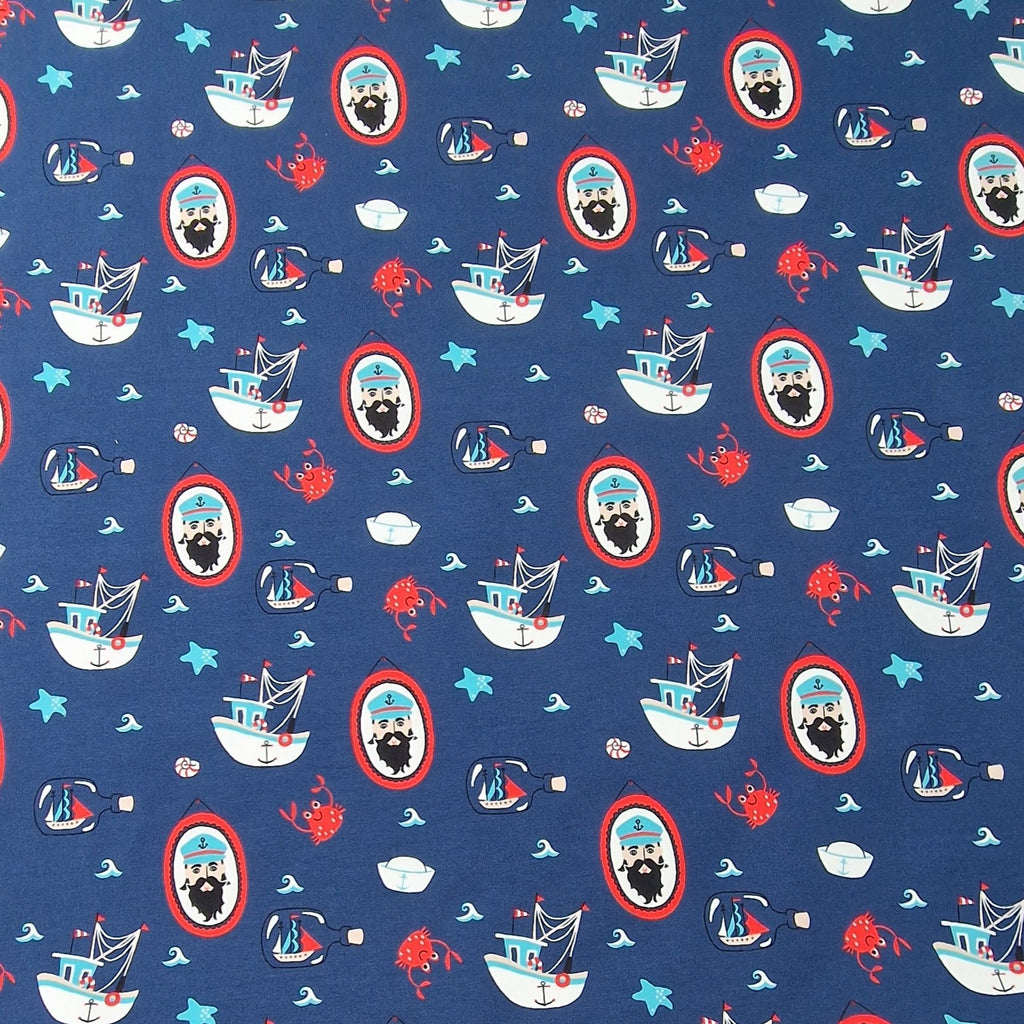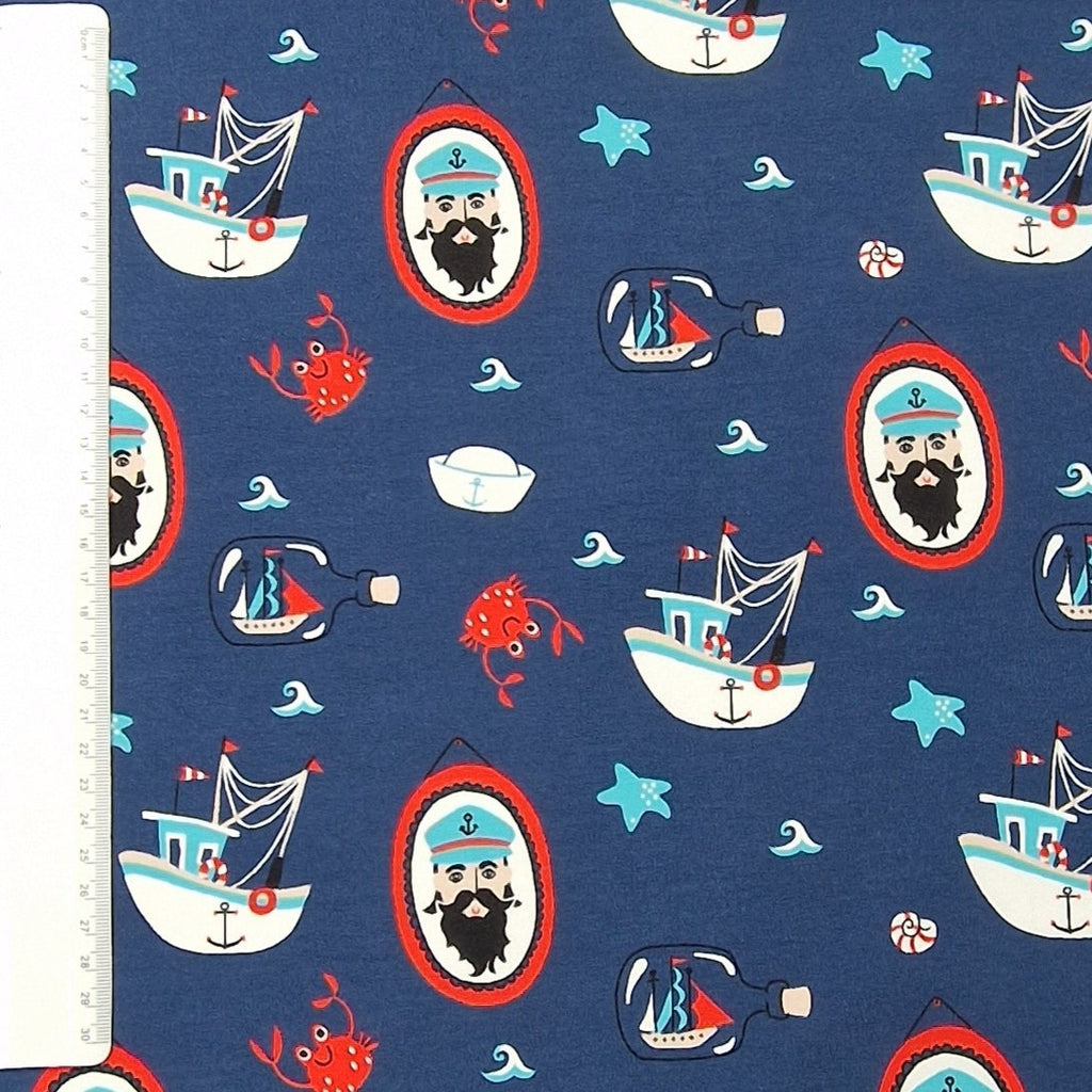 Blauer French Terry mit maritimen Aufdruck wie zum Beispiel Booten, Krebsen, Kapitän, Seestern und Muscheln.