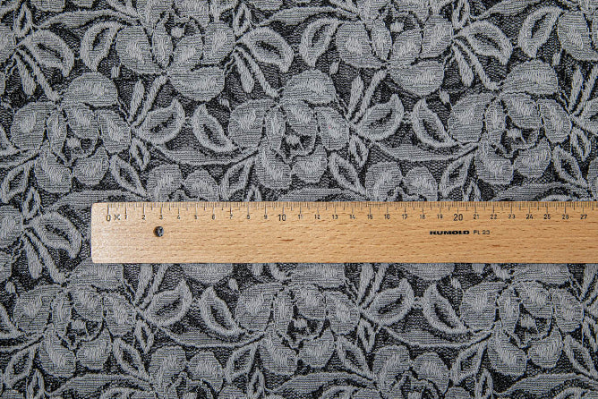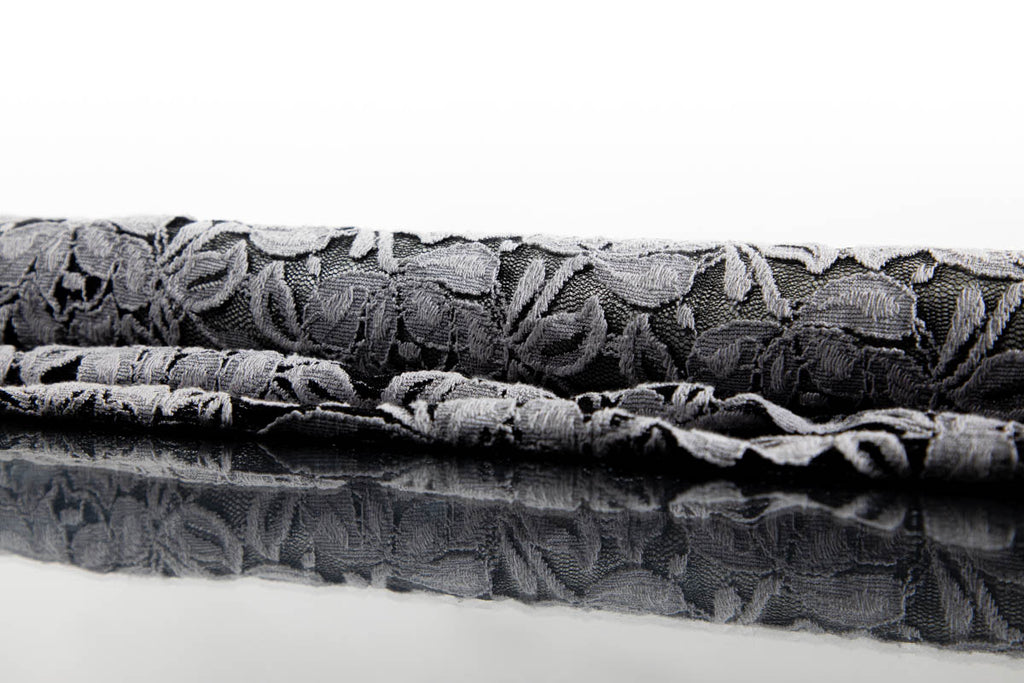 Eine graue transparente, elastische Spitze mit floralem Motiv.