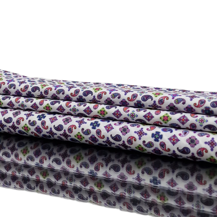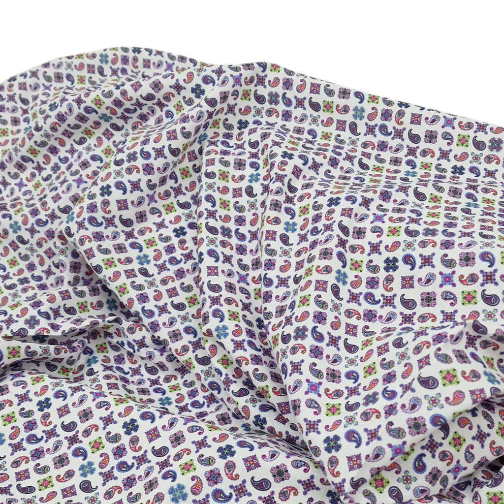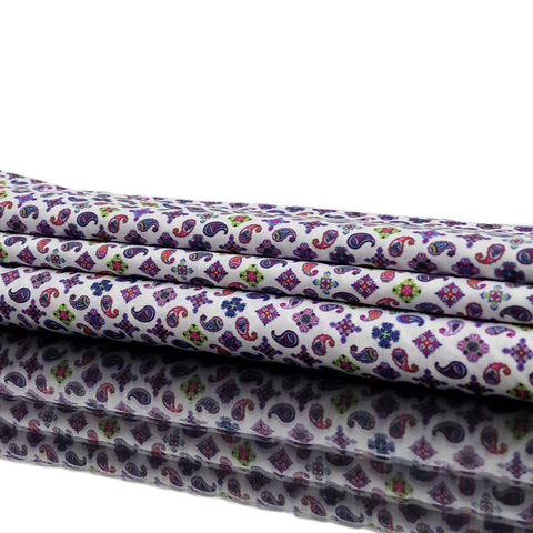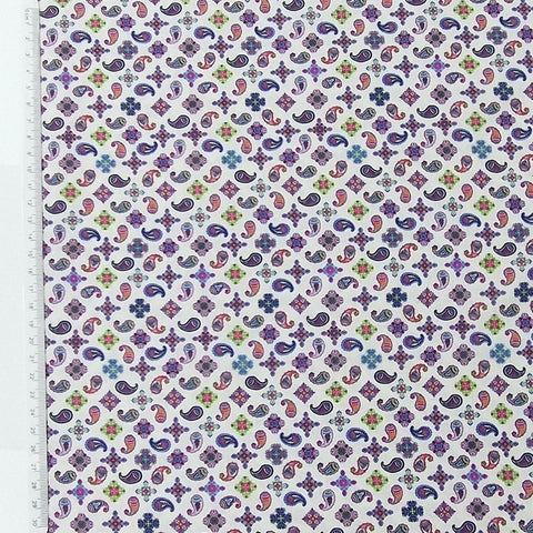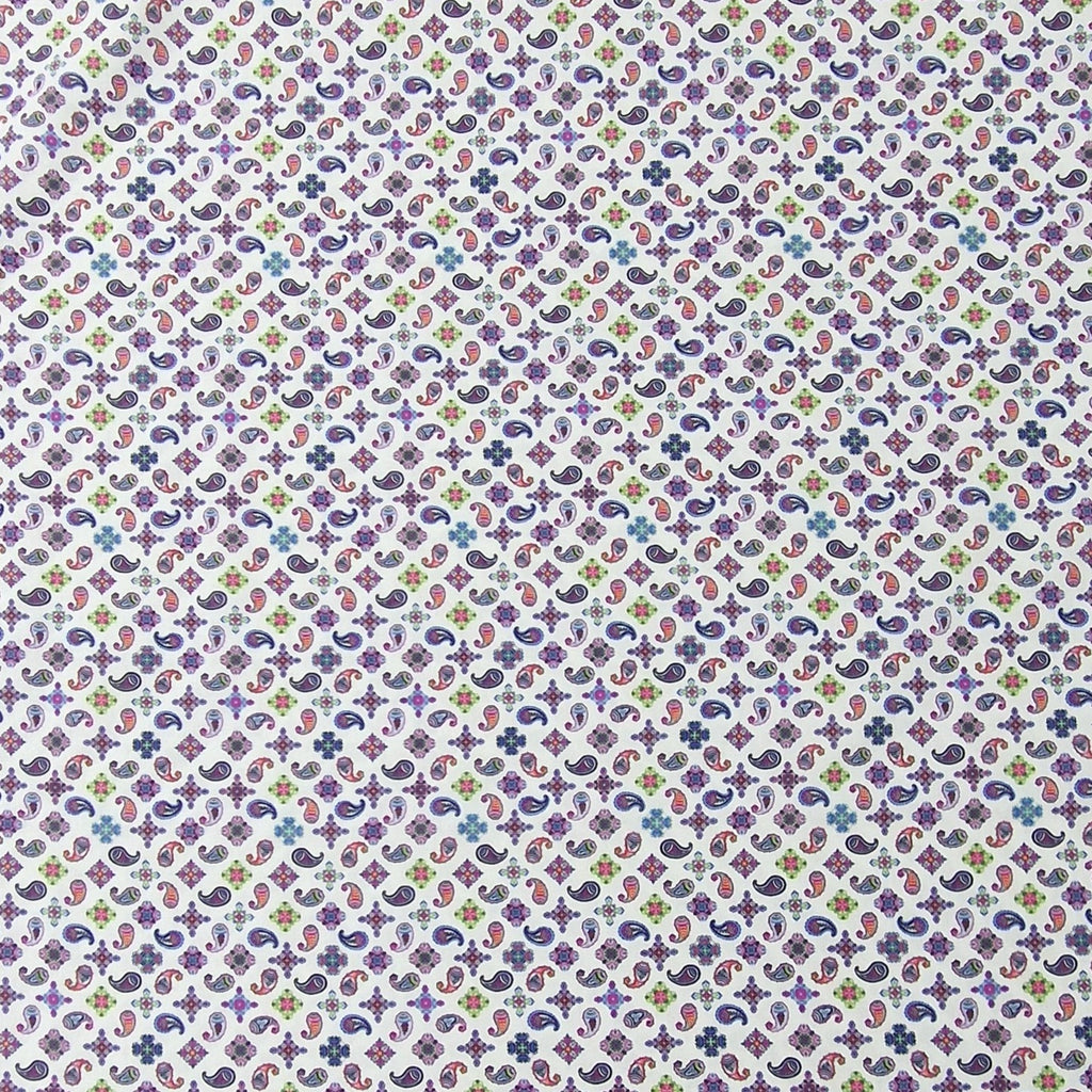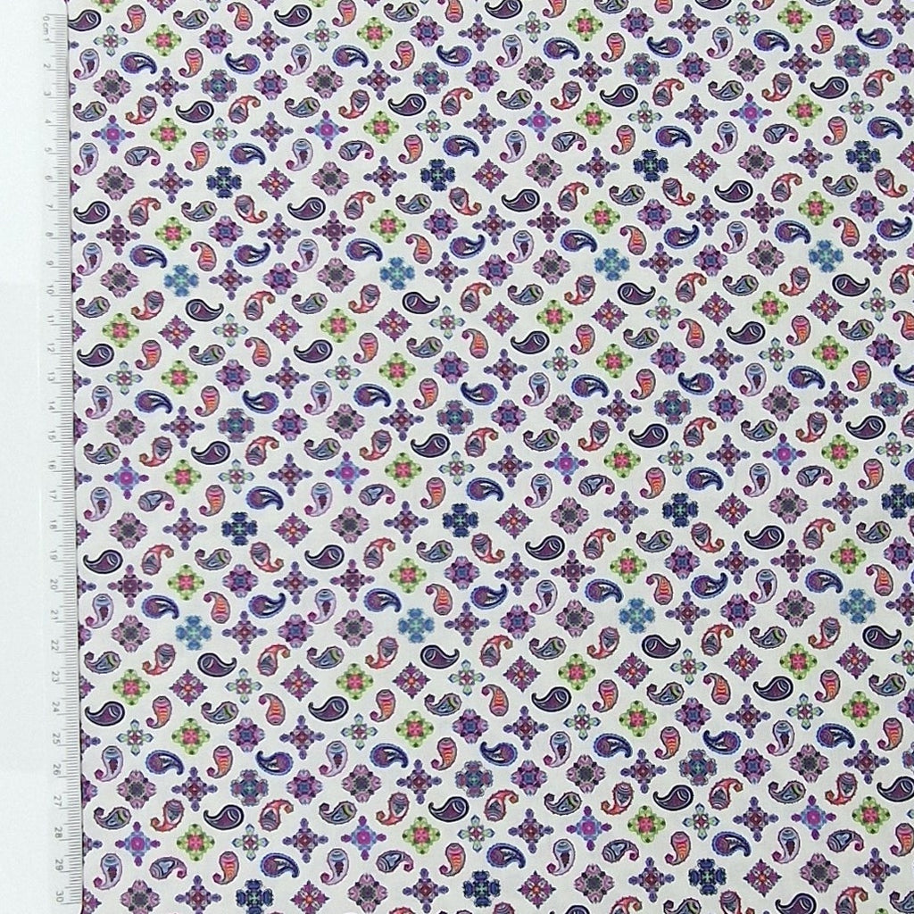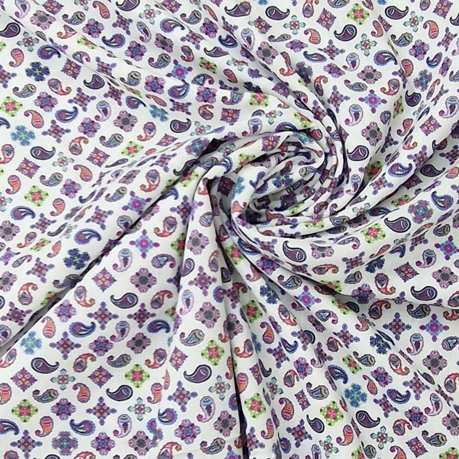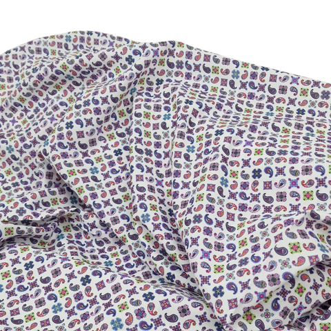 Sehr weicher Baumwollstoff aus 100% Baumwolle in weiß mit Paisley Muster in rosa und blau als Aufdruck