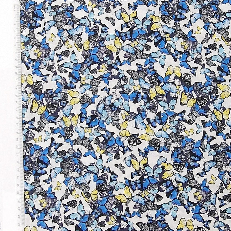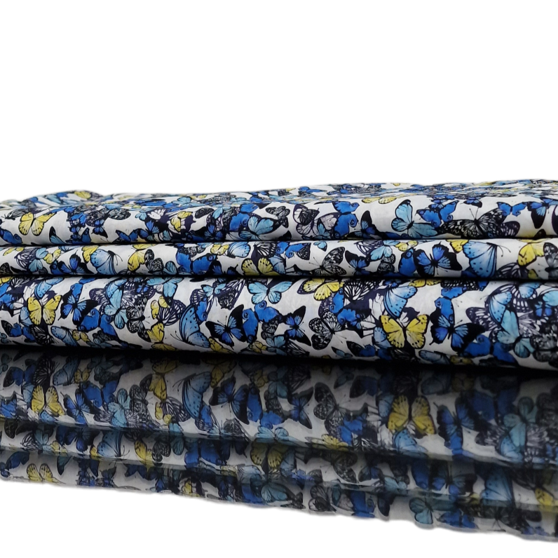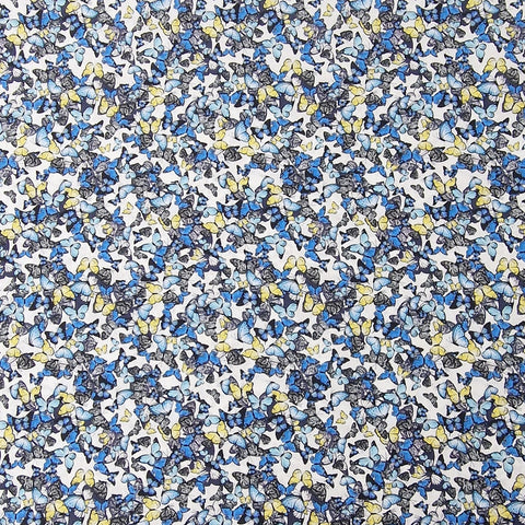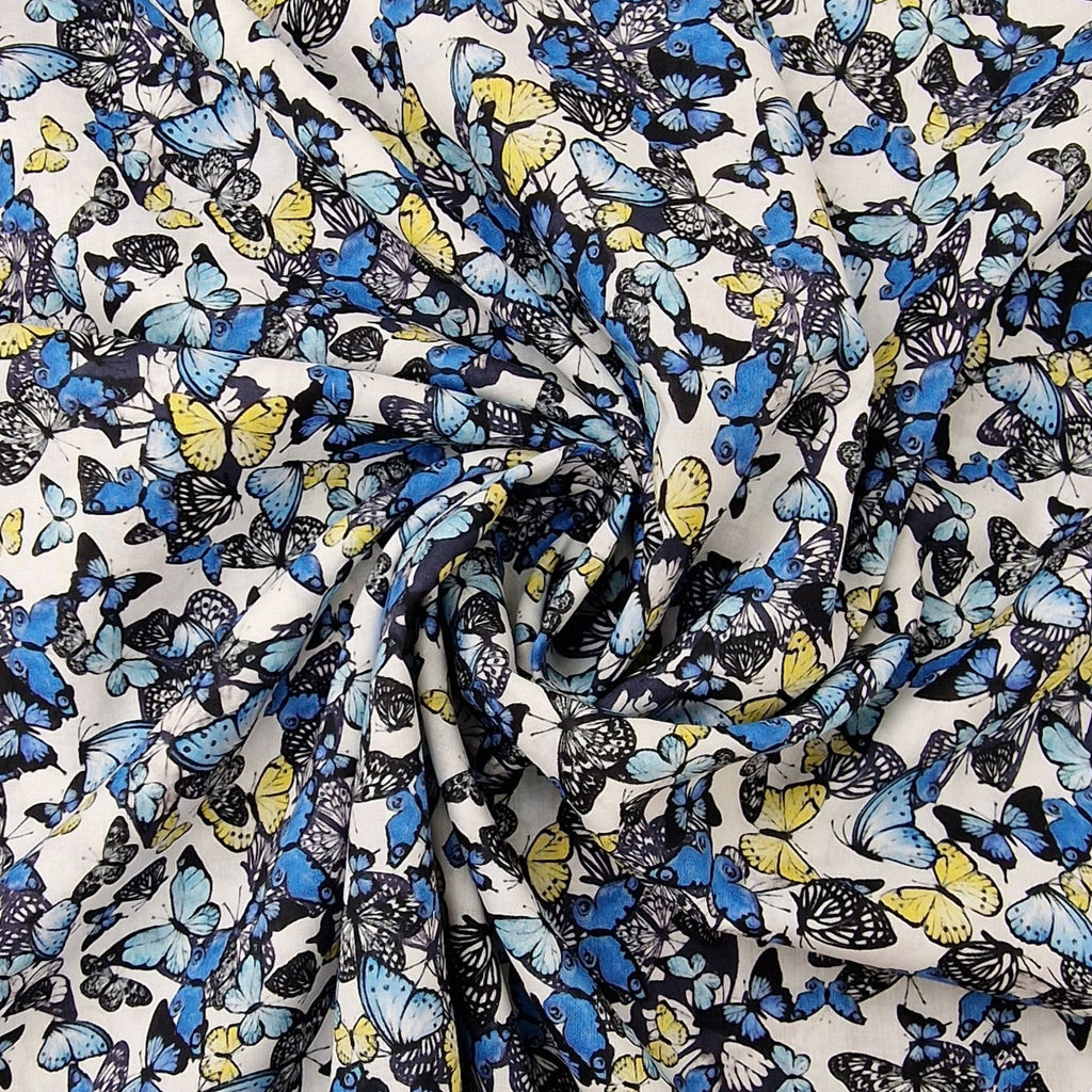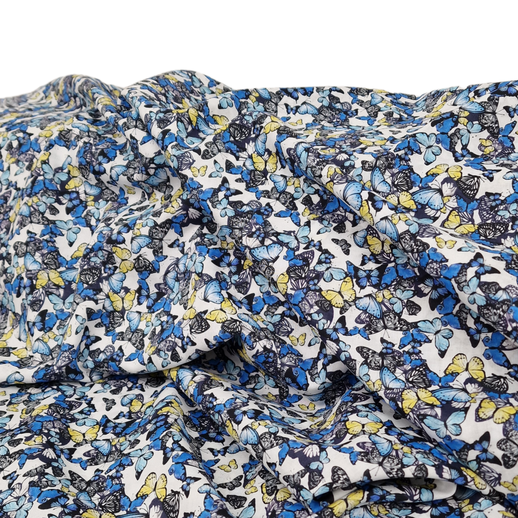 Sehr weicher Baumwollstoff aus 100% Baumwolle in weiß mit kleinen blauen Schmetterlingen als Aufdruck