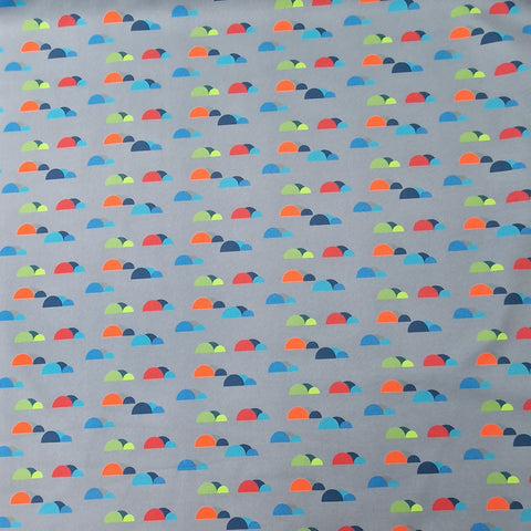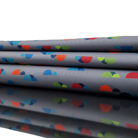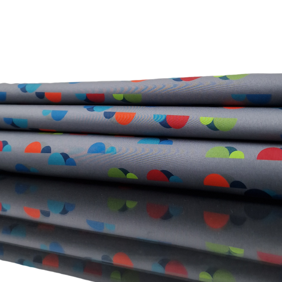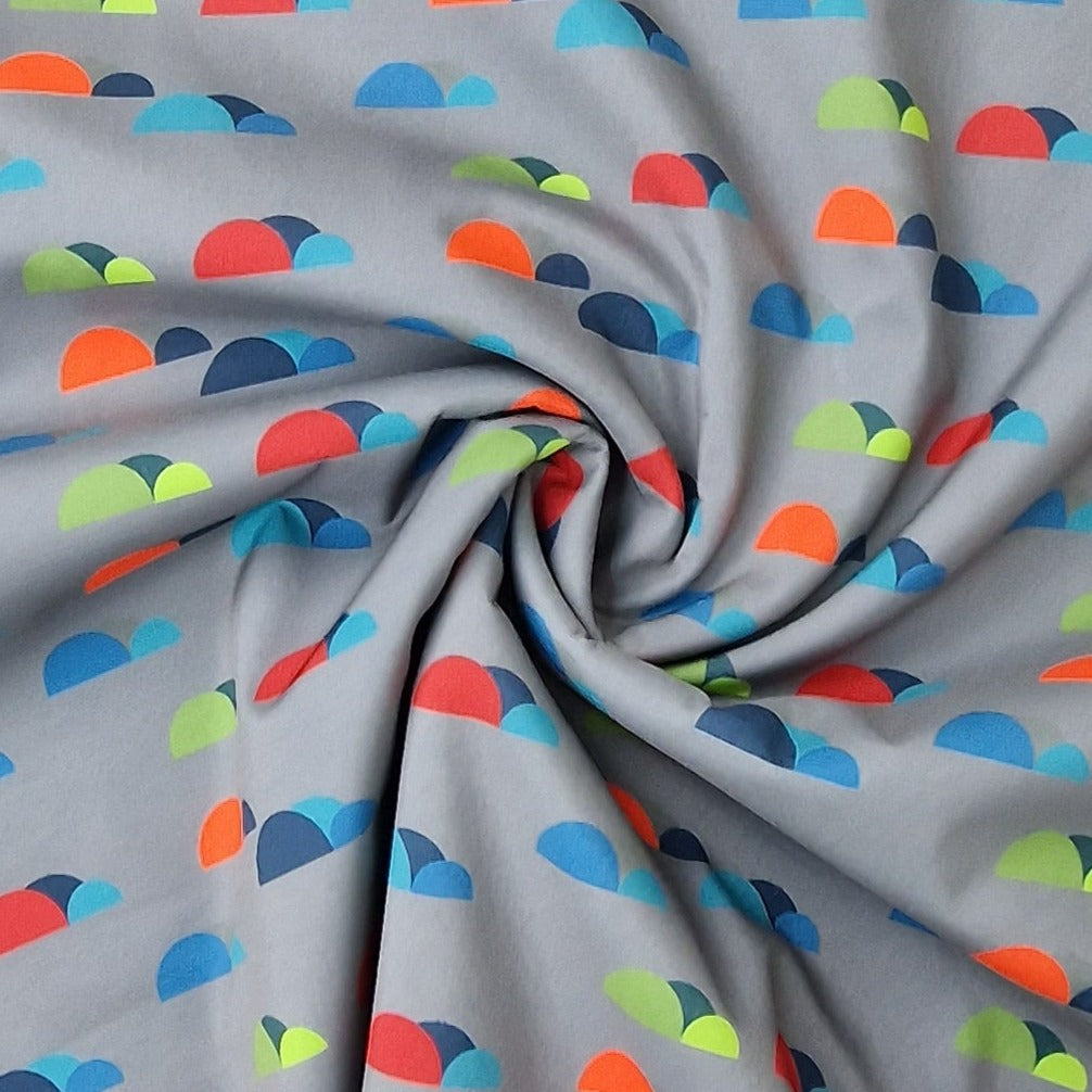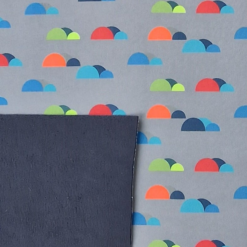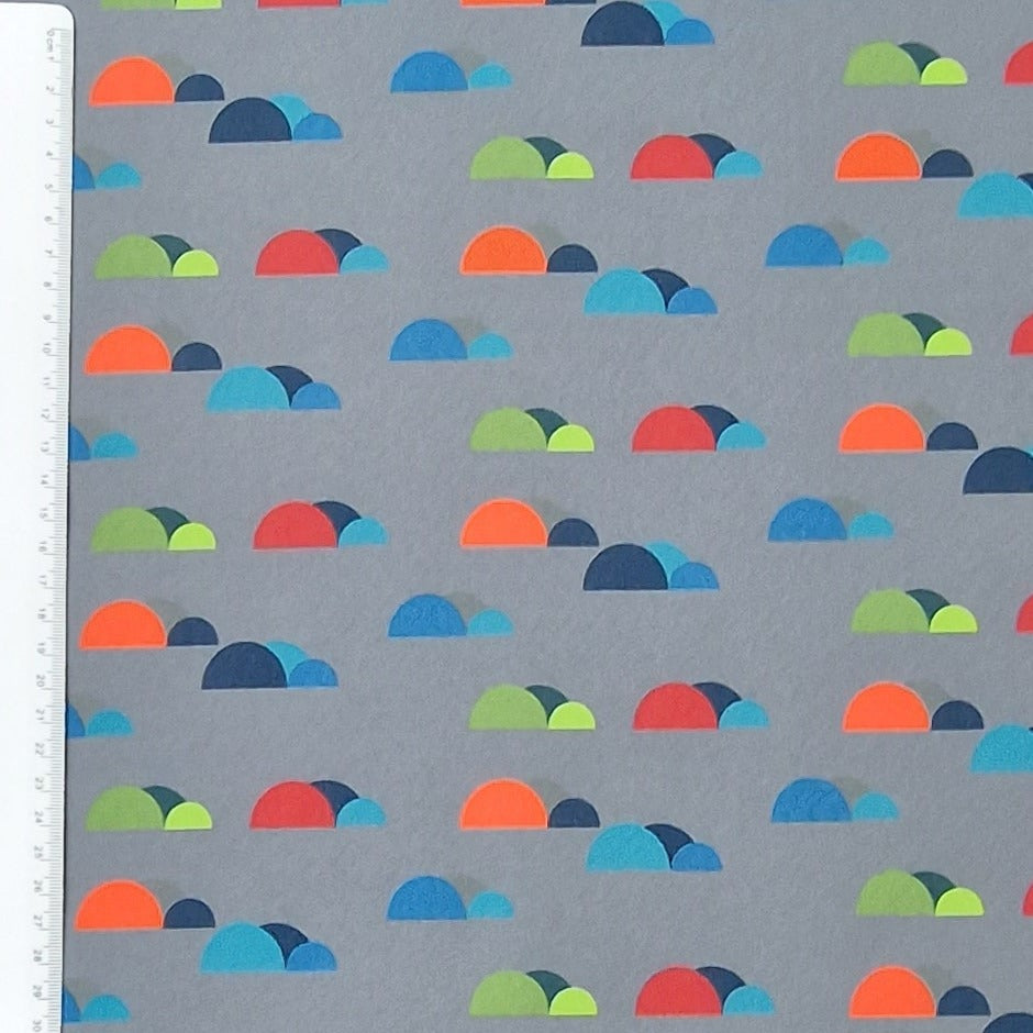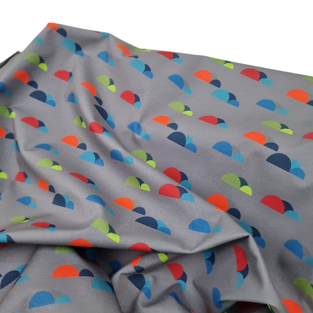 Grauer Softshell mit bunten Halbkreisen aus Aufdruck.