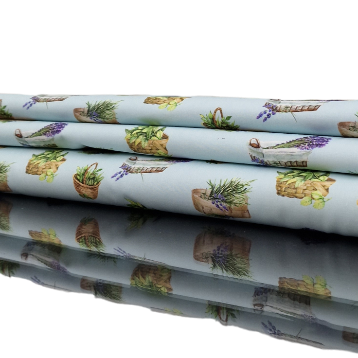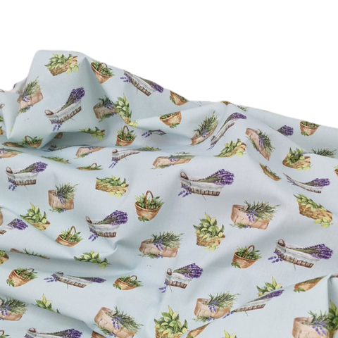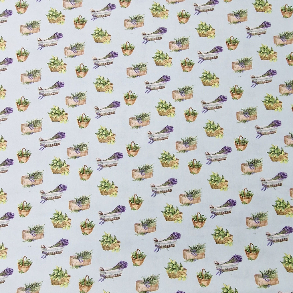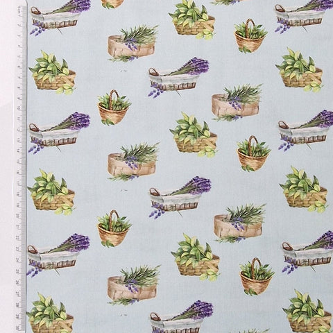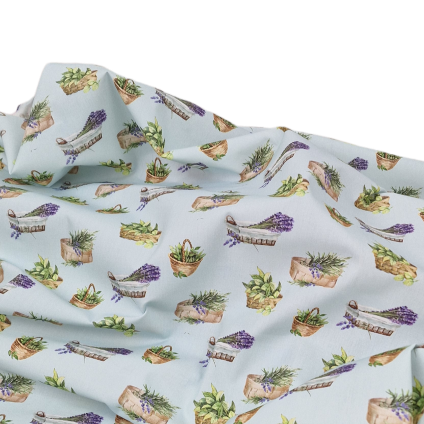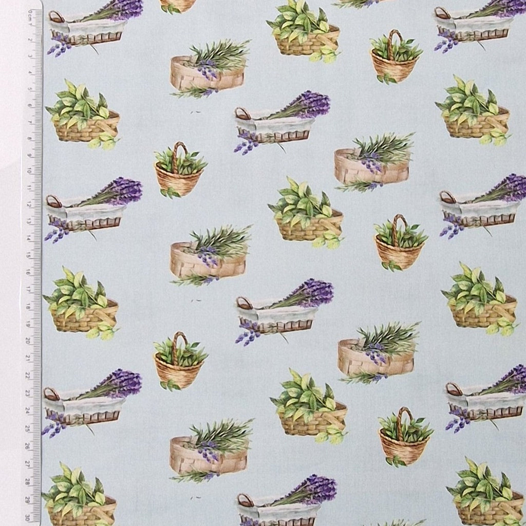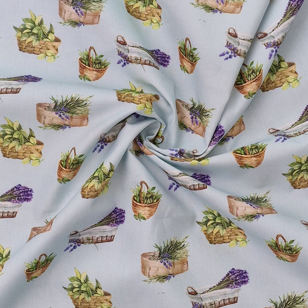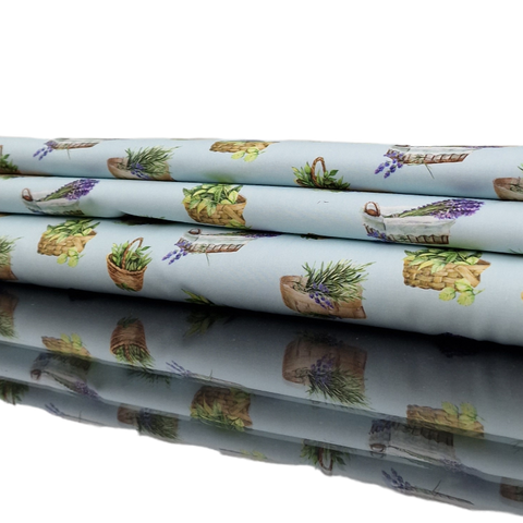 Sehr weicher Baumwollstoff aus 100% Baumwolle in hellblau mit unterschiedlichen Lavendelkörbchen und Kräuterkörbchen als Aufdruck.