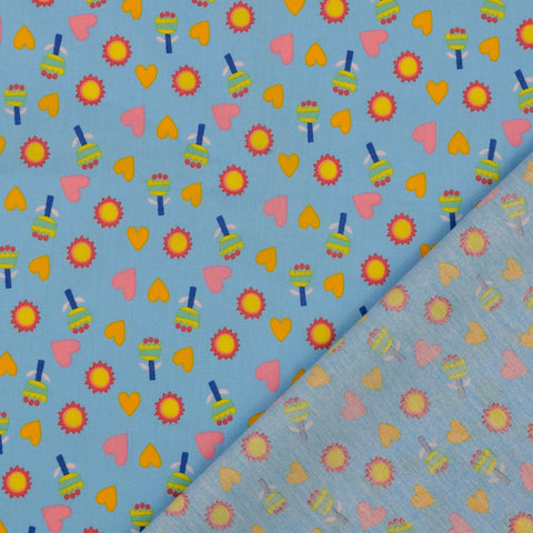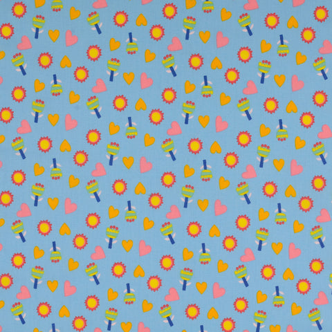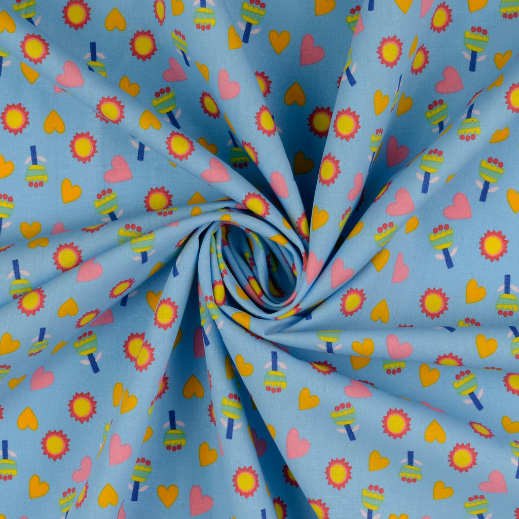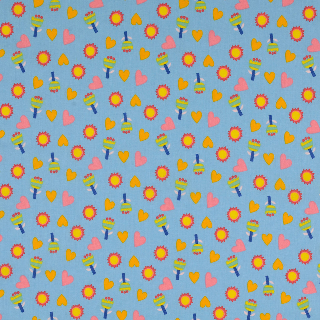 Baumwollstoff aus 100% Baumwolle in blau mit Herzen, Blumen und der Sonne als Aufdruck.