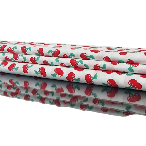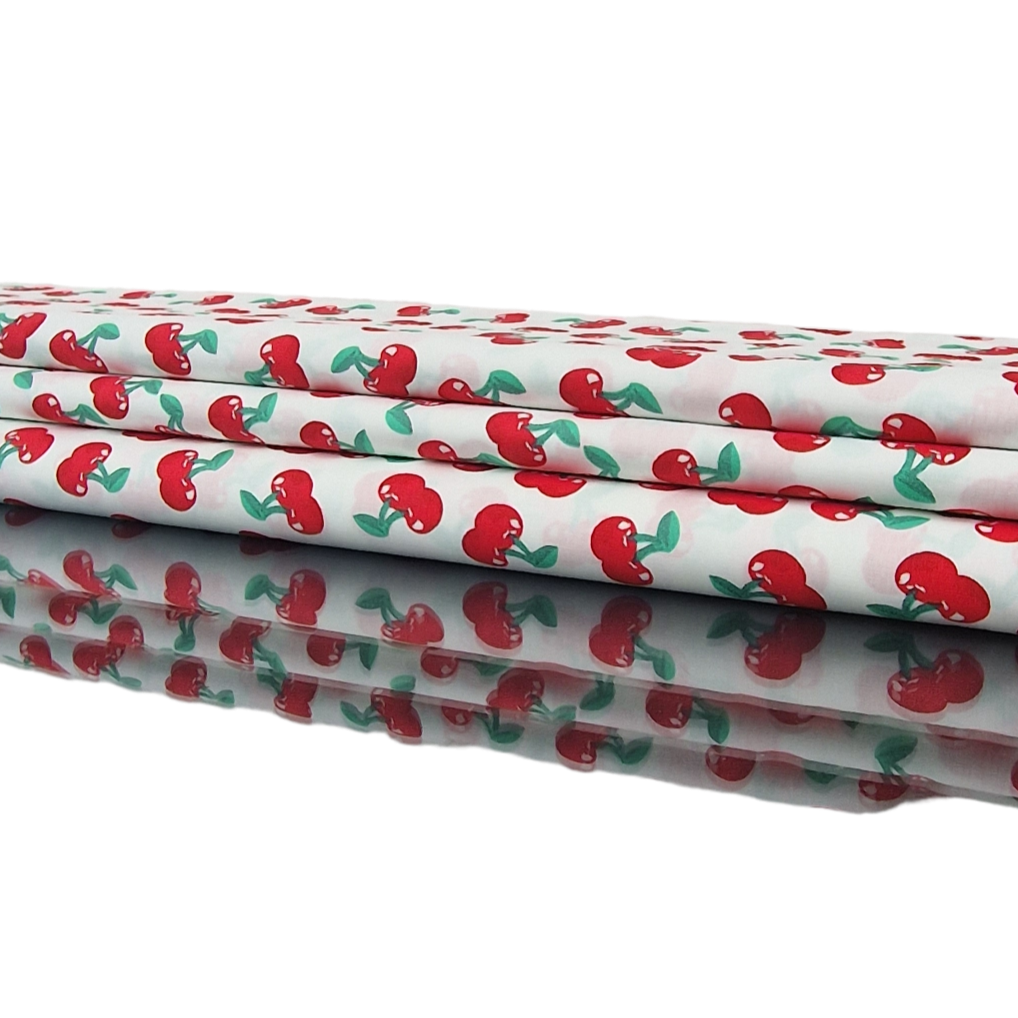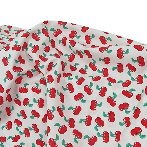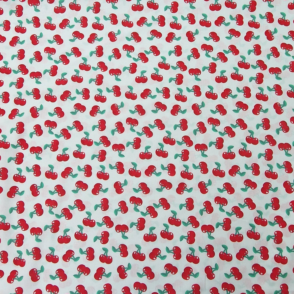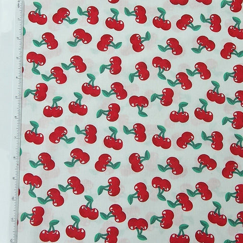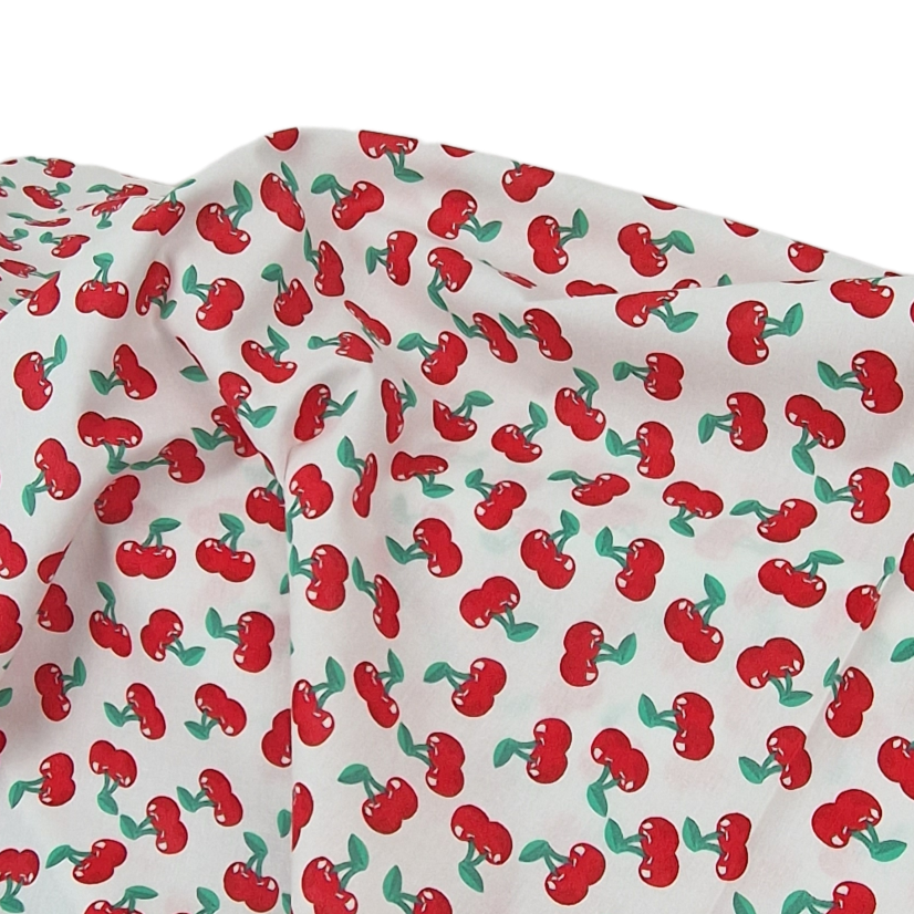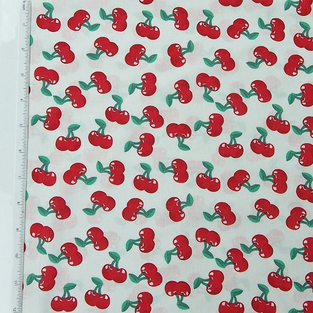 Baumwollstoff aus 100% Baumwolle in weiß mit roten Kirschen als Aufdruck