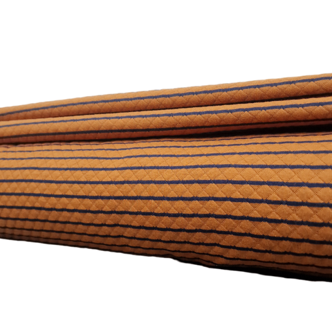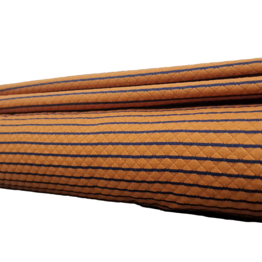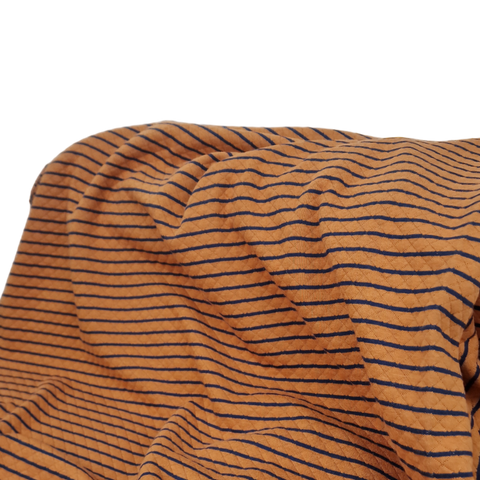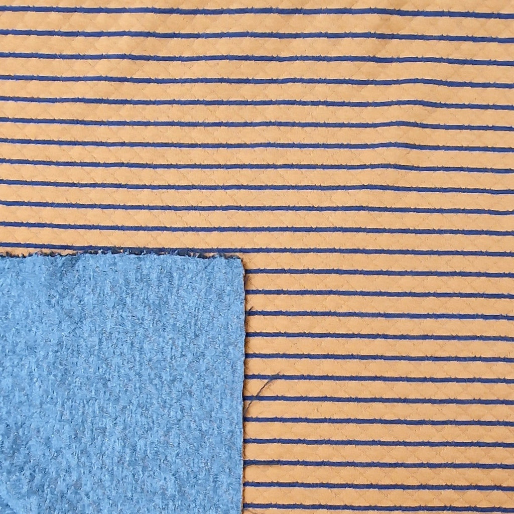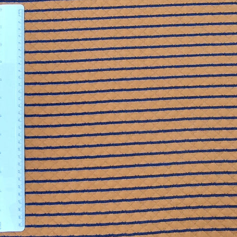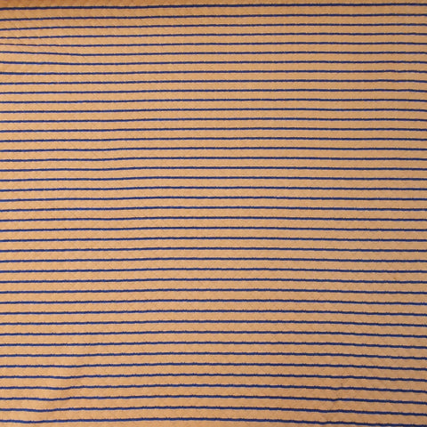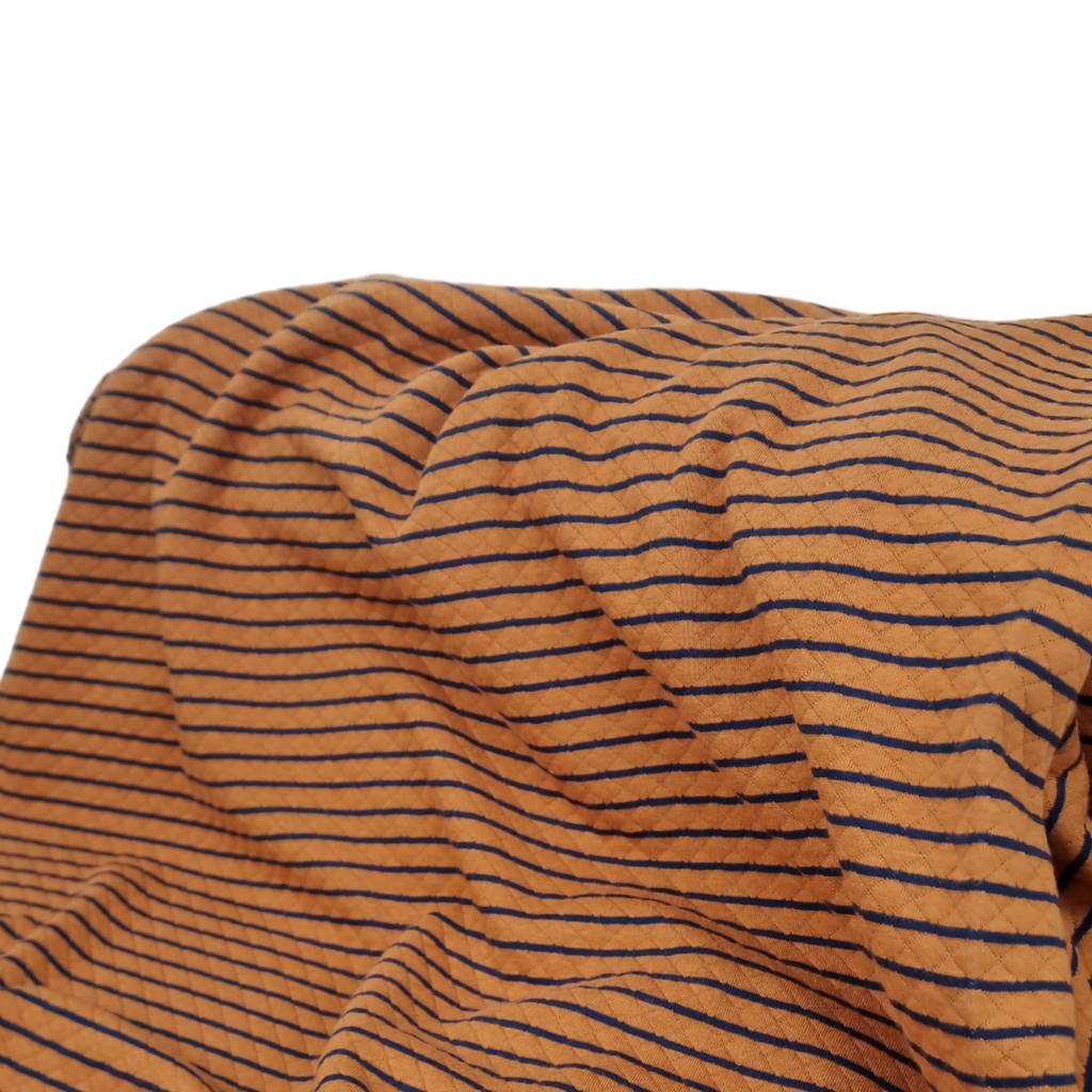 Kuschelig weicher Quilt Yarn als doubleface in Ocker / dunkelblau gestreift. Die Streifen aus ocker sind hier aber deutlich breiter als die in dunkelblau.