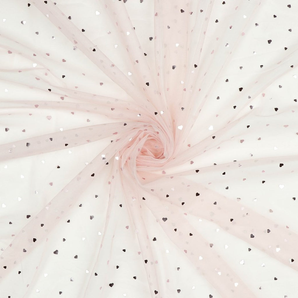 Rosafarbener Tüll mit Folienherzen in silber und rosa.
