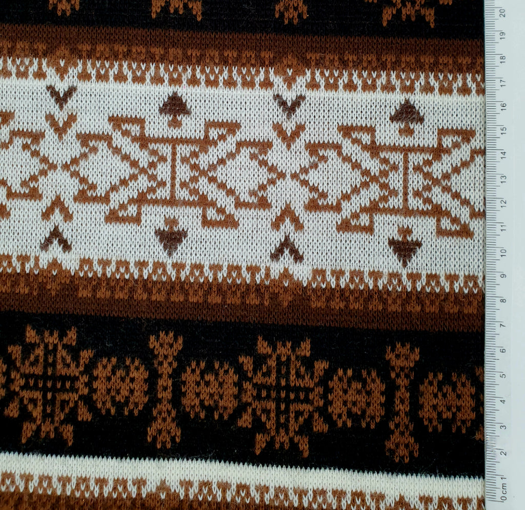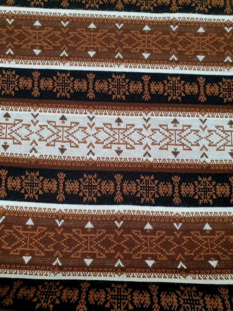 der Strickstoff erinnert mit seinem braun schwarz weißen Mustern an das klassische Norweger Muster. Er eignet sich sehr gut für warme Kleidung. Der Stoff ist auf der Rückseite glatt, dadurch fühlt er sich noch weicher an. Durch das markante Streifenmuster muss je nach Schnitt im Rapport zugeschnitten werden.