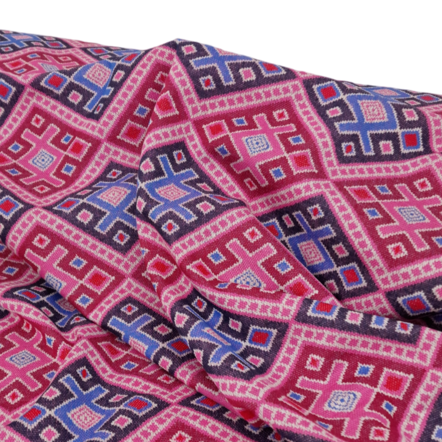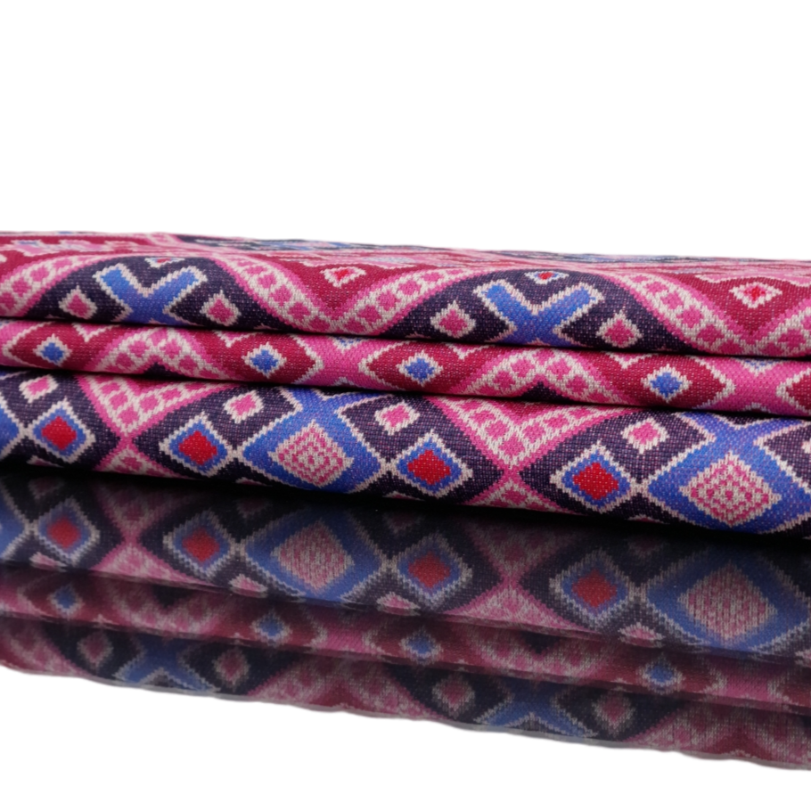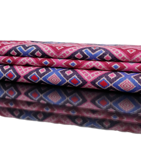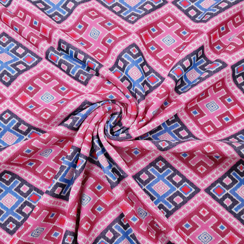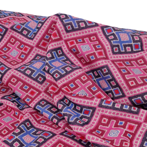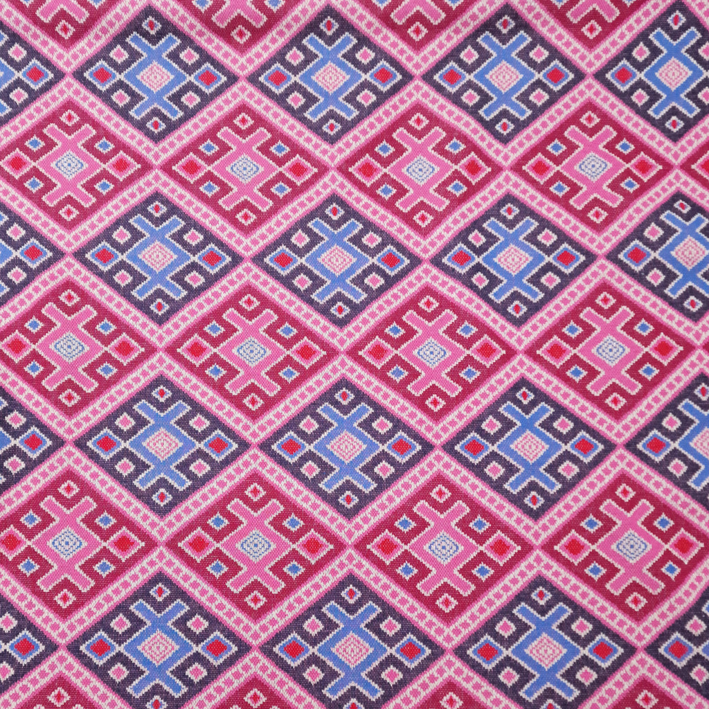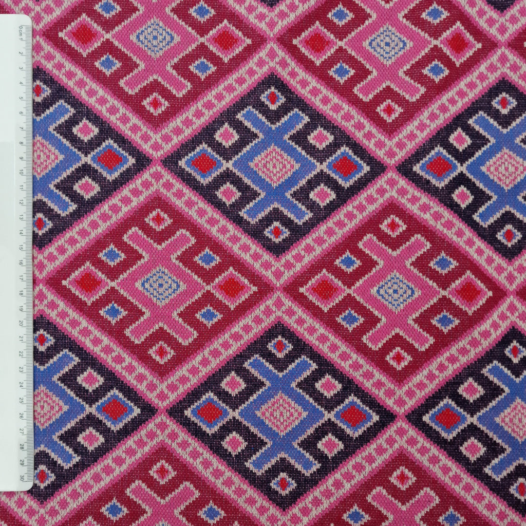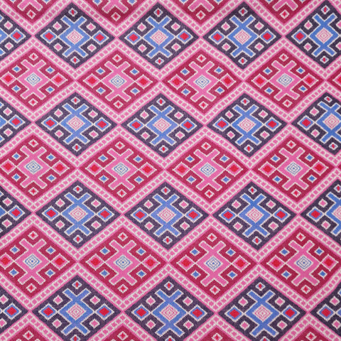 Strick in rosa und pink sowie blau als Rauten und Vierecke.