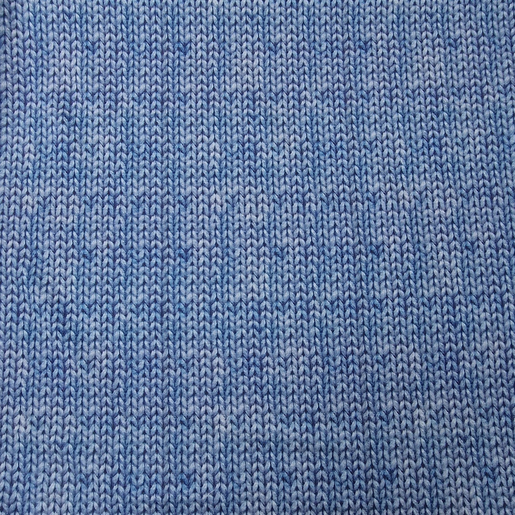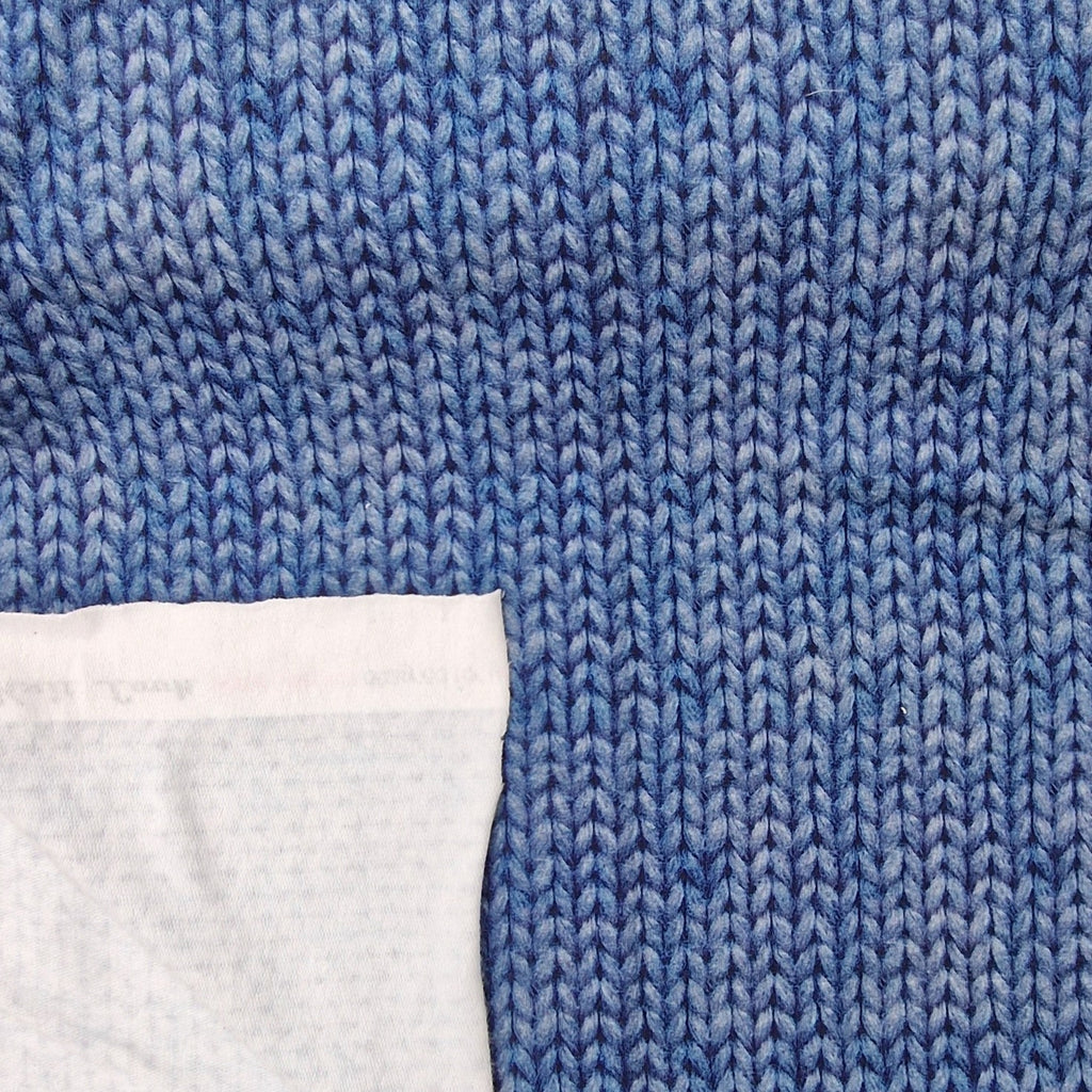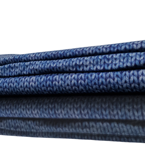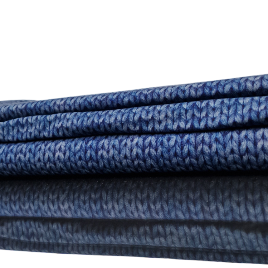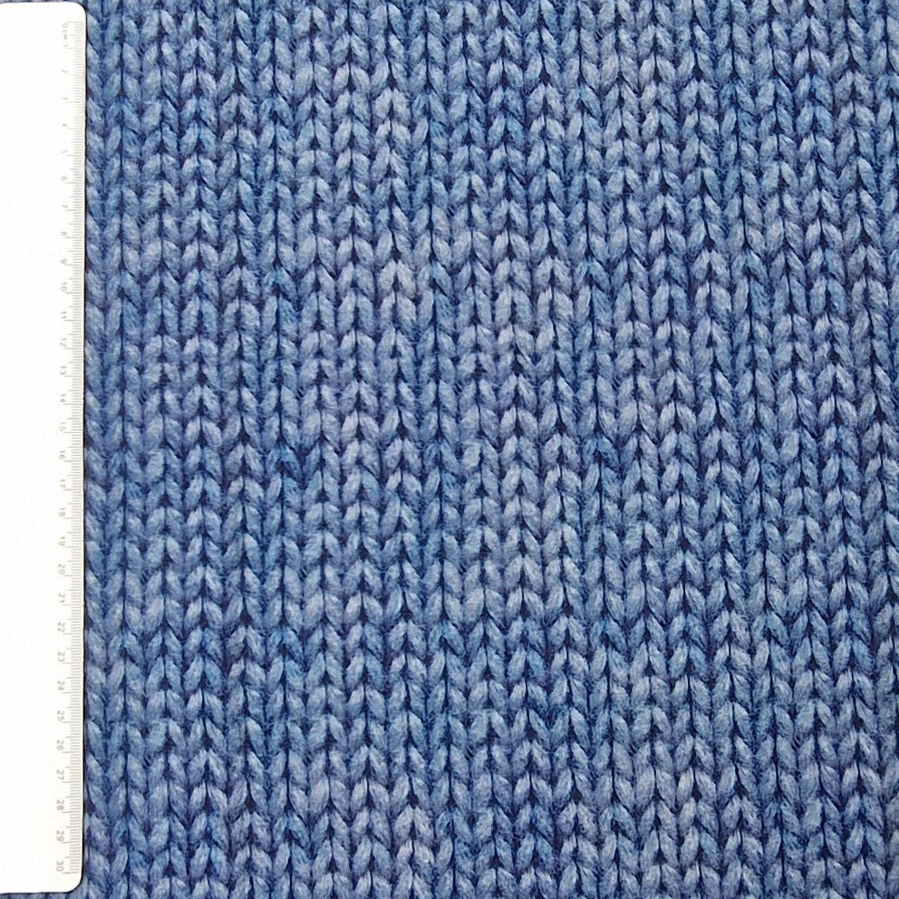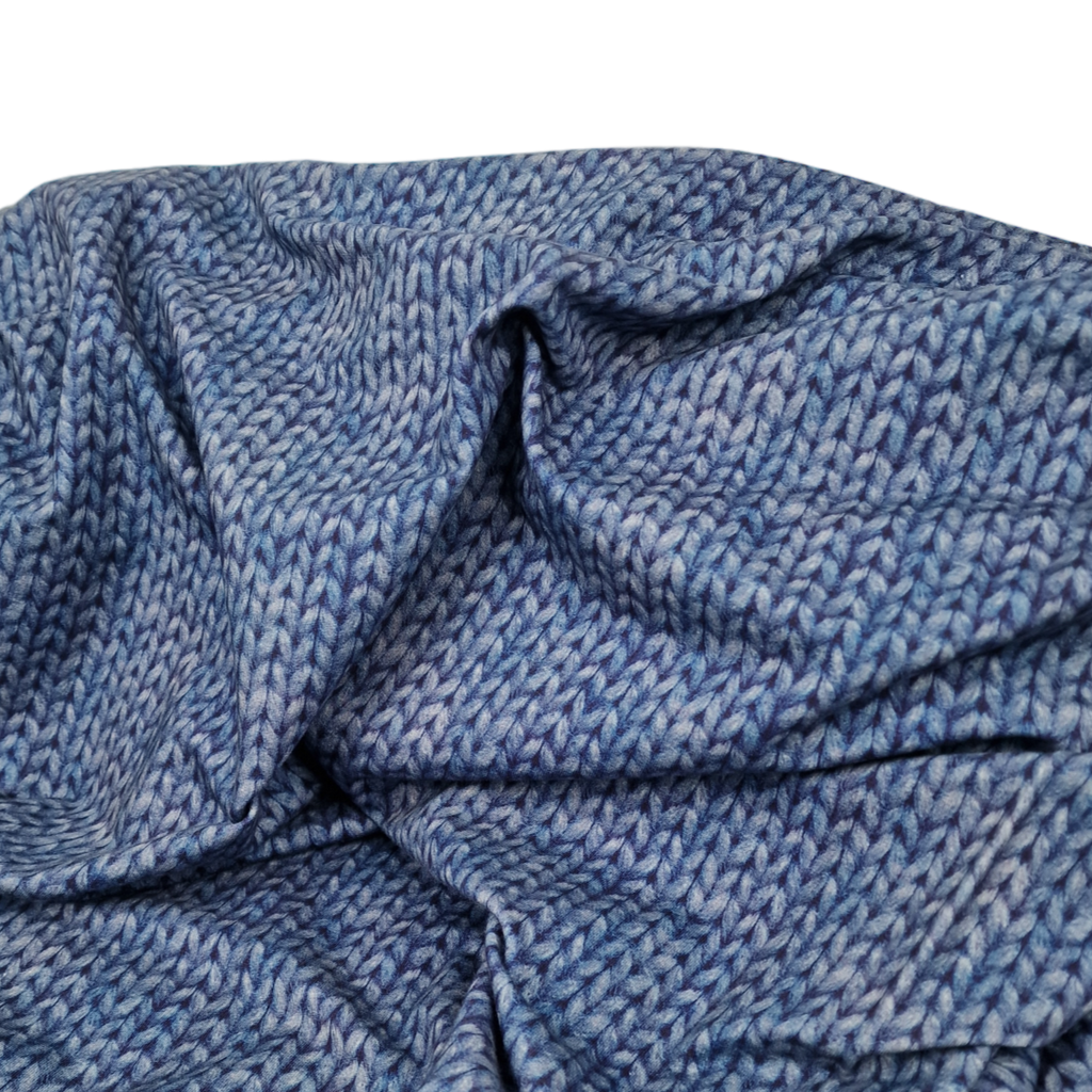 Kuschelig weicher Sweatstoff in jeansblau mit einem Strickmusster.