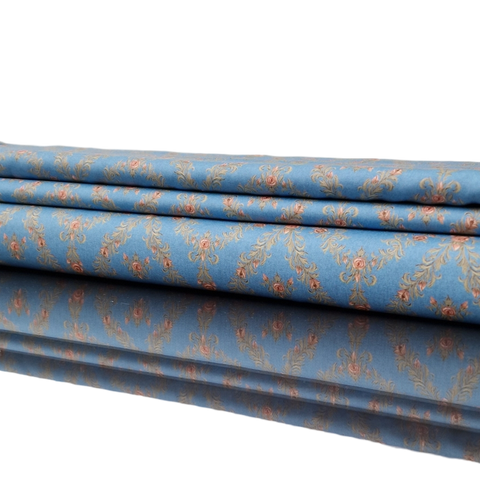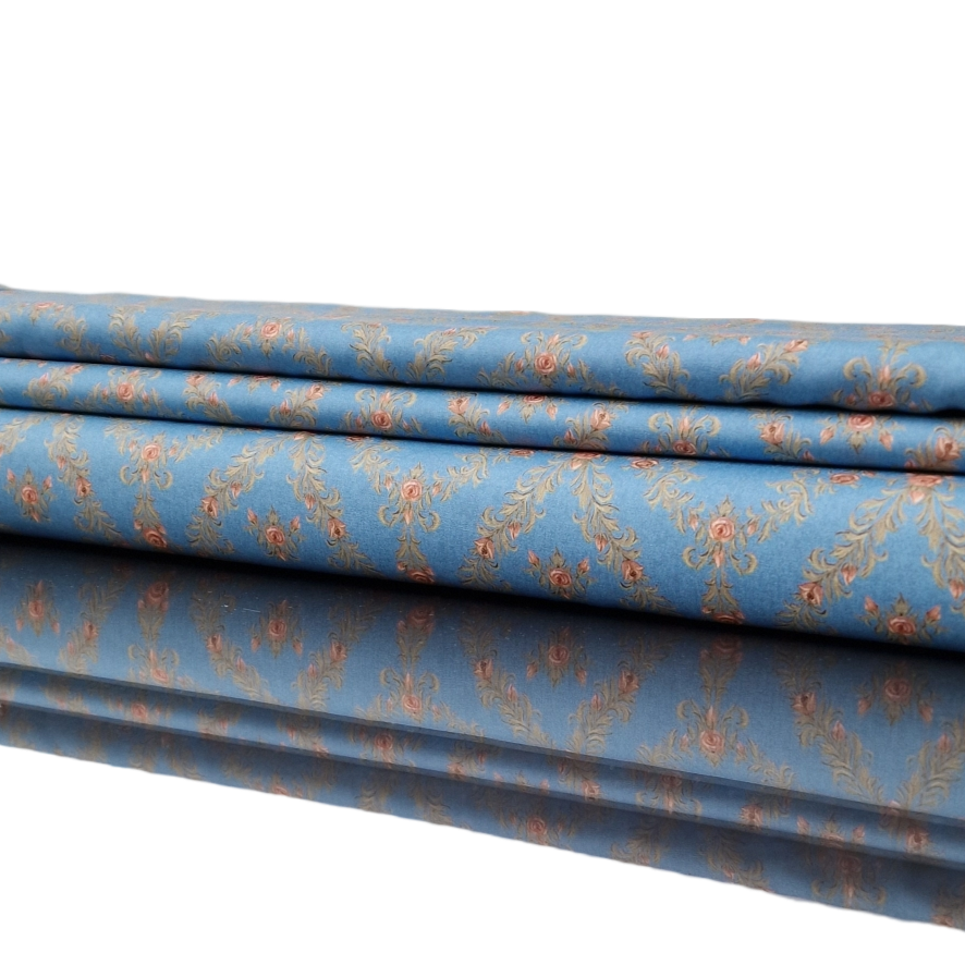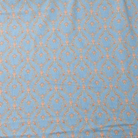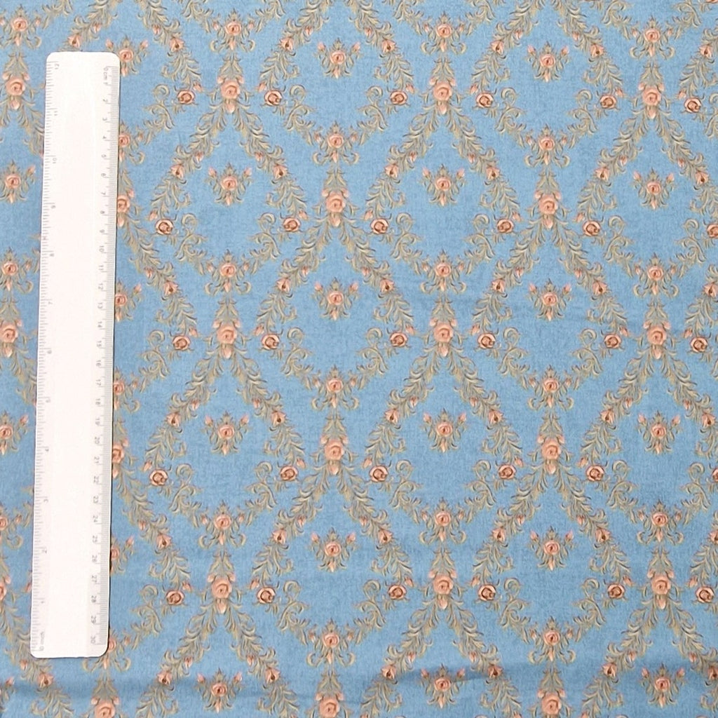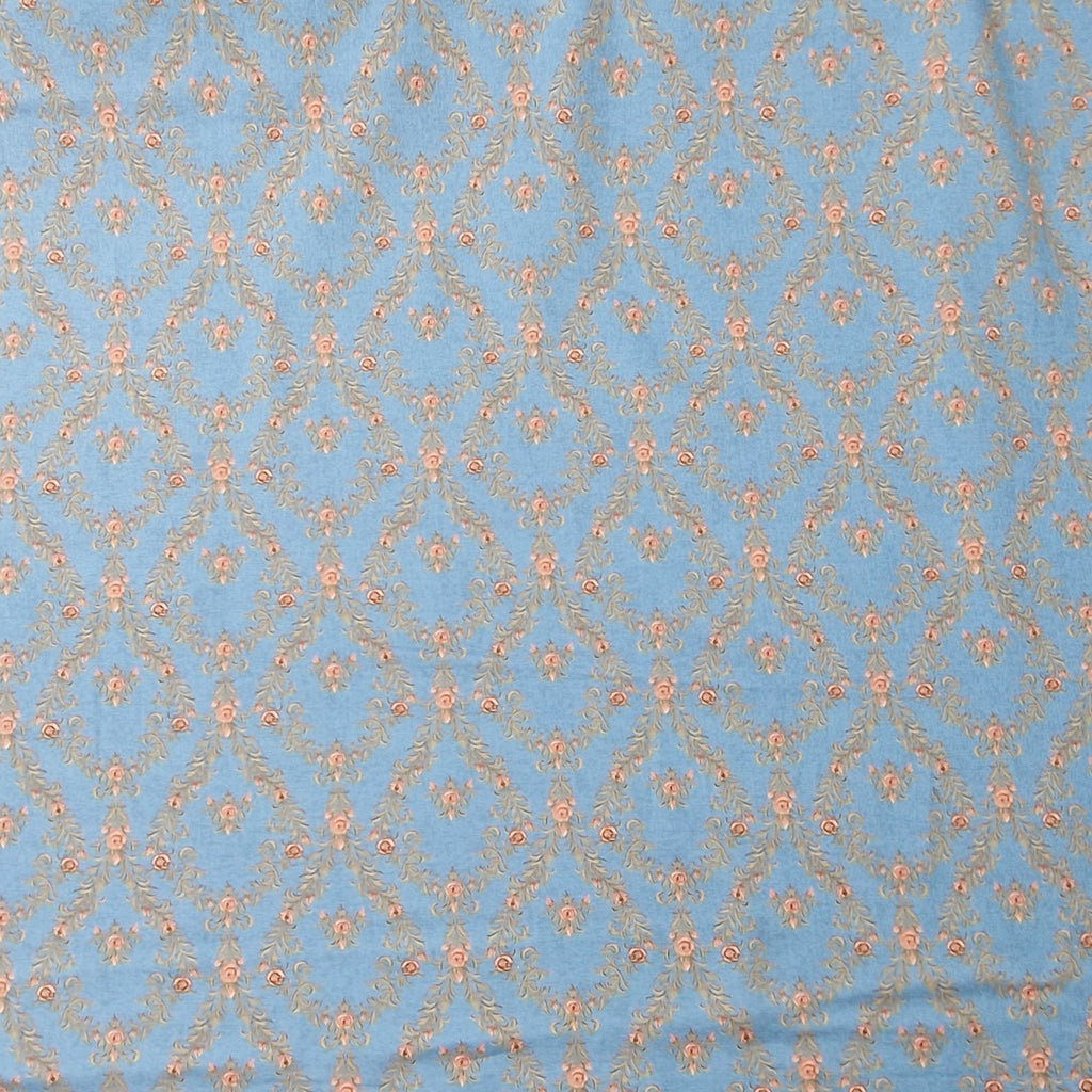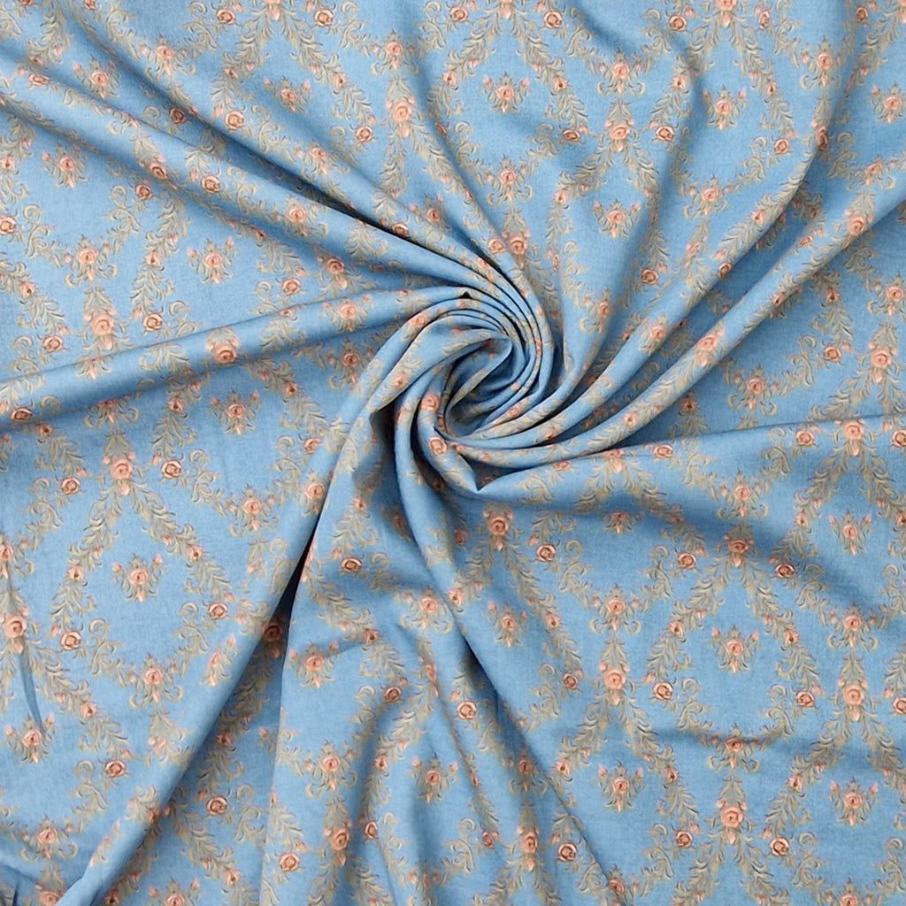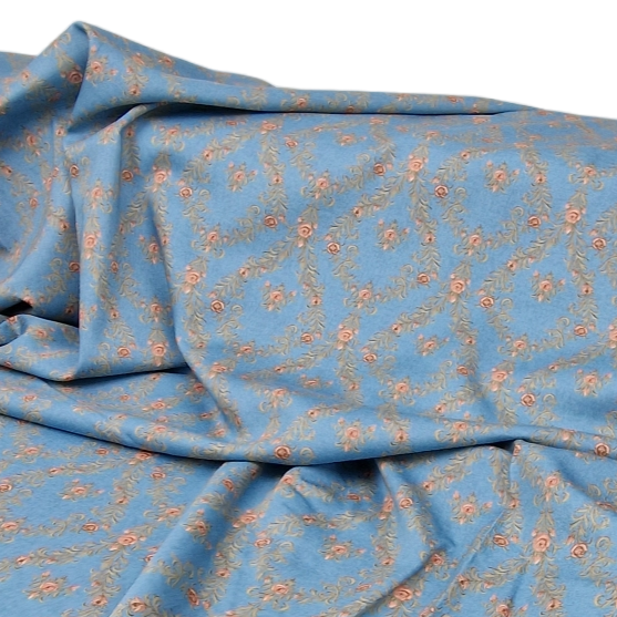 100% Viskose mit Ranken und Rosen auf hellblauem Untergrund.