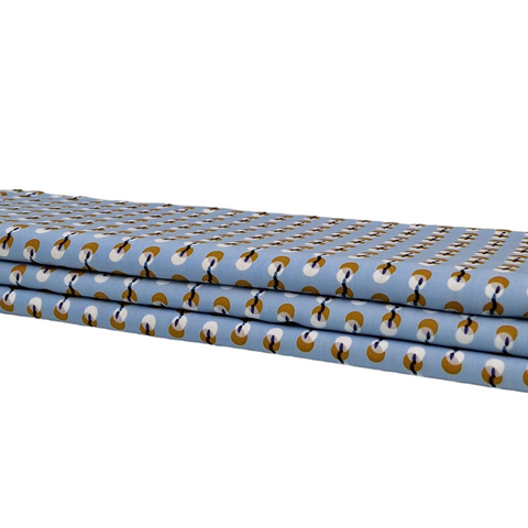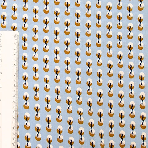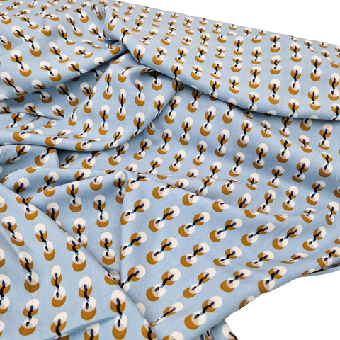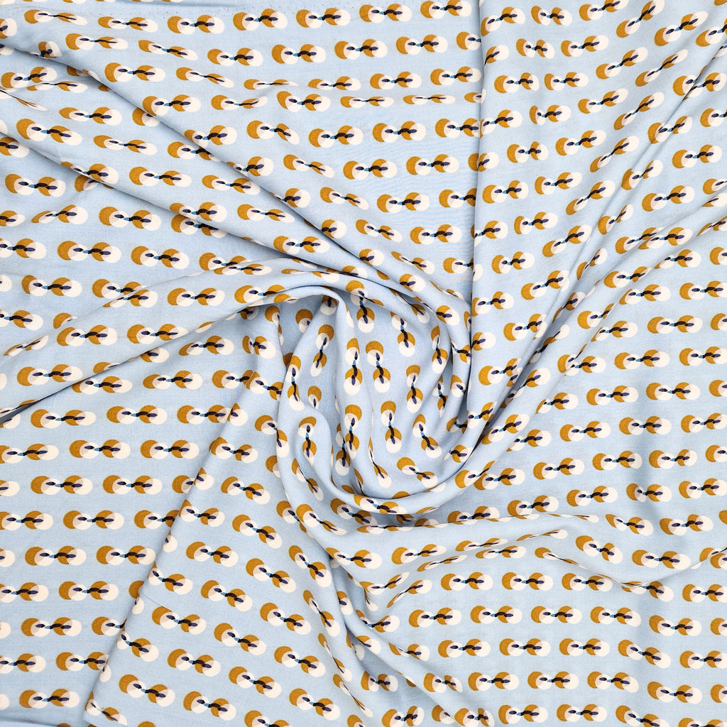 Viskose in hellblau mit weißen und senfgelben Kreisen.