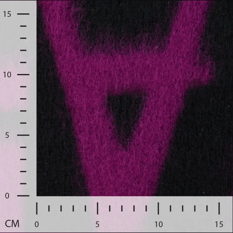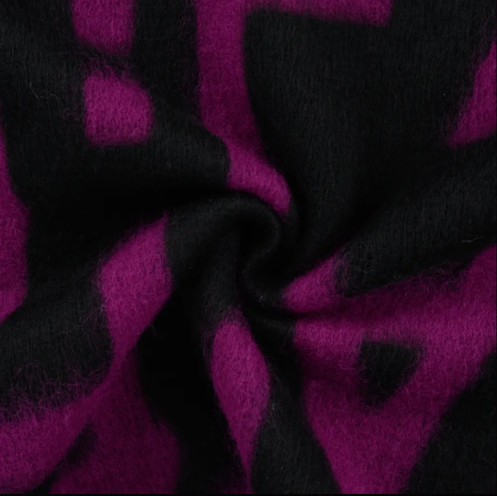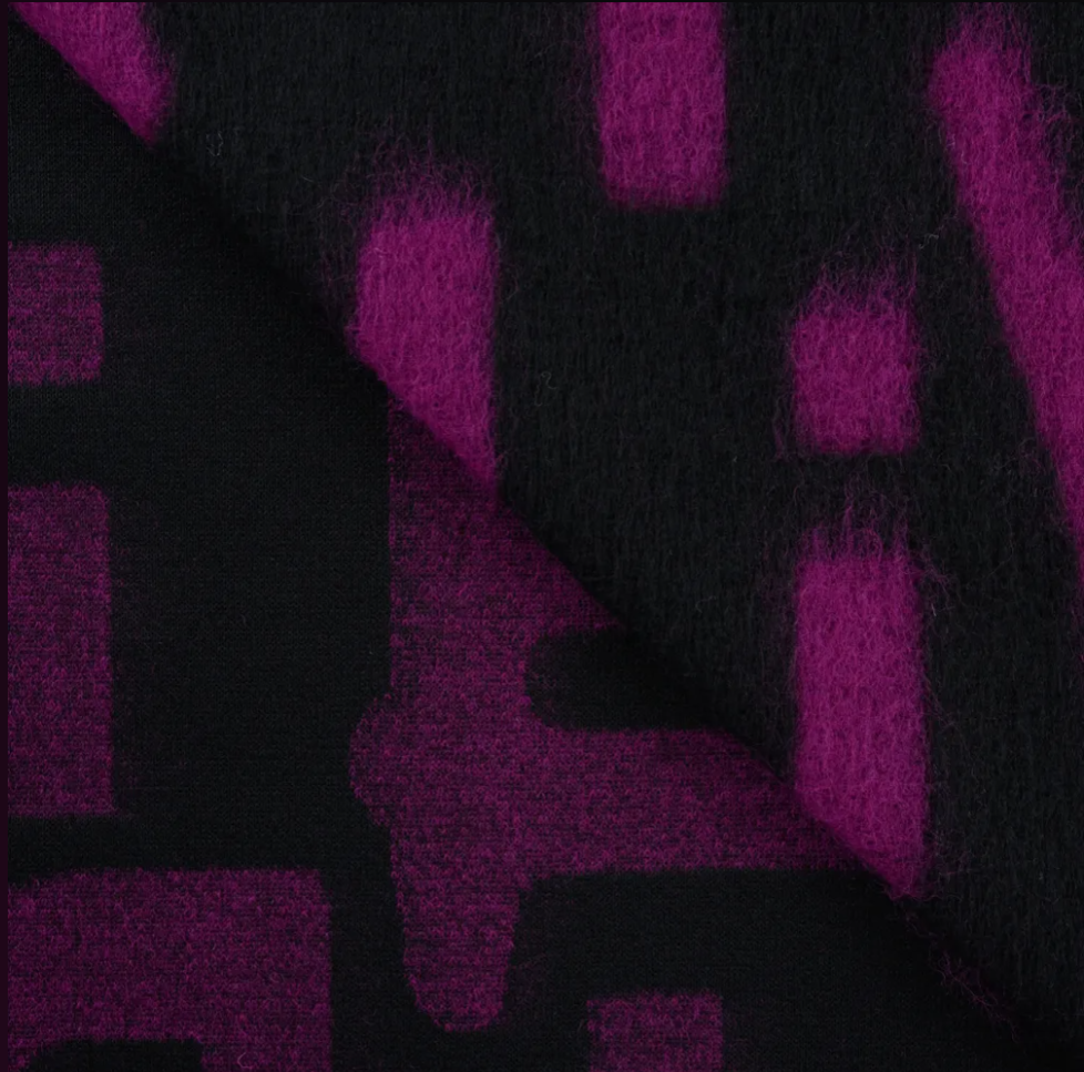 Kuschelig schwarzer Wollstoff mit modischen Buchstaben als Aufdruck. Der Wollstoff ist schwarz und hat lila Buchstaben als Highlight.