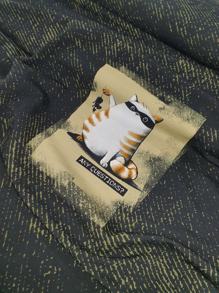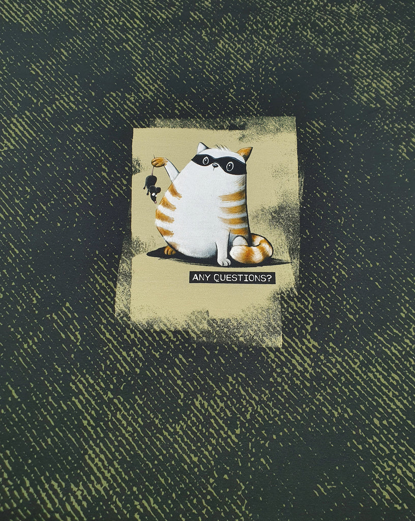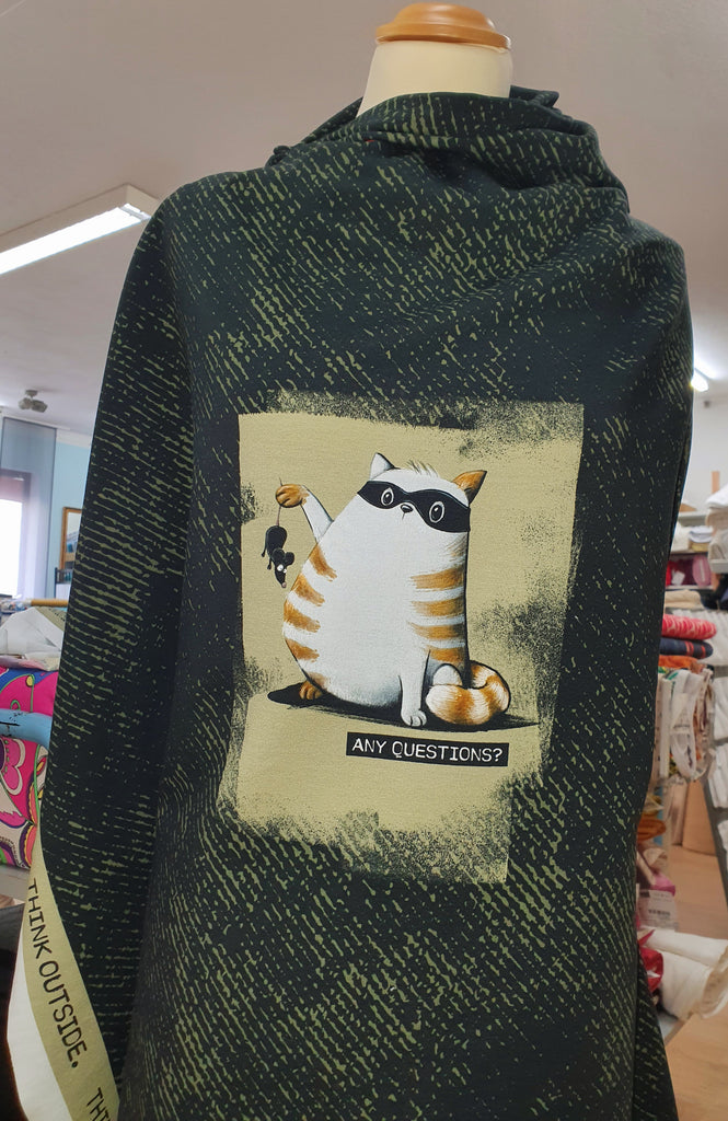 French Terry Paneel mit einer frechen Katze als Aufdruck. Die Rückseite vom Paneel ist mit dem Grundmuster bedruckt. Dazu gibt es den passenden Kombistoff in grün schwarz gemustert.